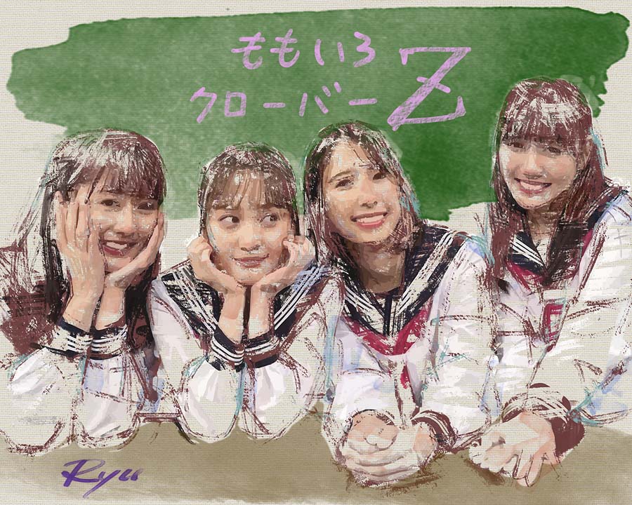 4girls artist_name black_sailor_collar brown_hair closed_mouth commentary_request east_asian grin hands_on_own_face looking_at_another looking_at_viewer looking_to_the_side momoiro_clover_z momota_kanako multiple_girls neckerchief own_hands_together pink_neckerchief realistic ryu_(ftyh2578) sailor_collar sailor_shirt sasaki_ayaka school_uniform shirt sideways_glance smile takagi_reni tamai_shiori white_shirt