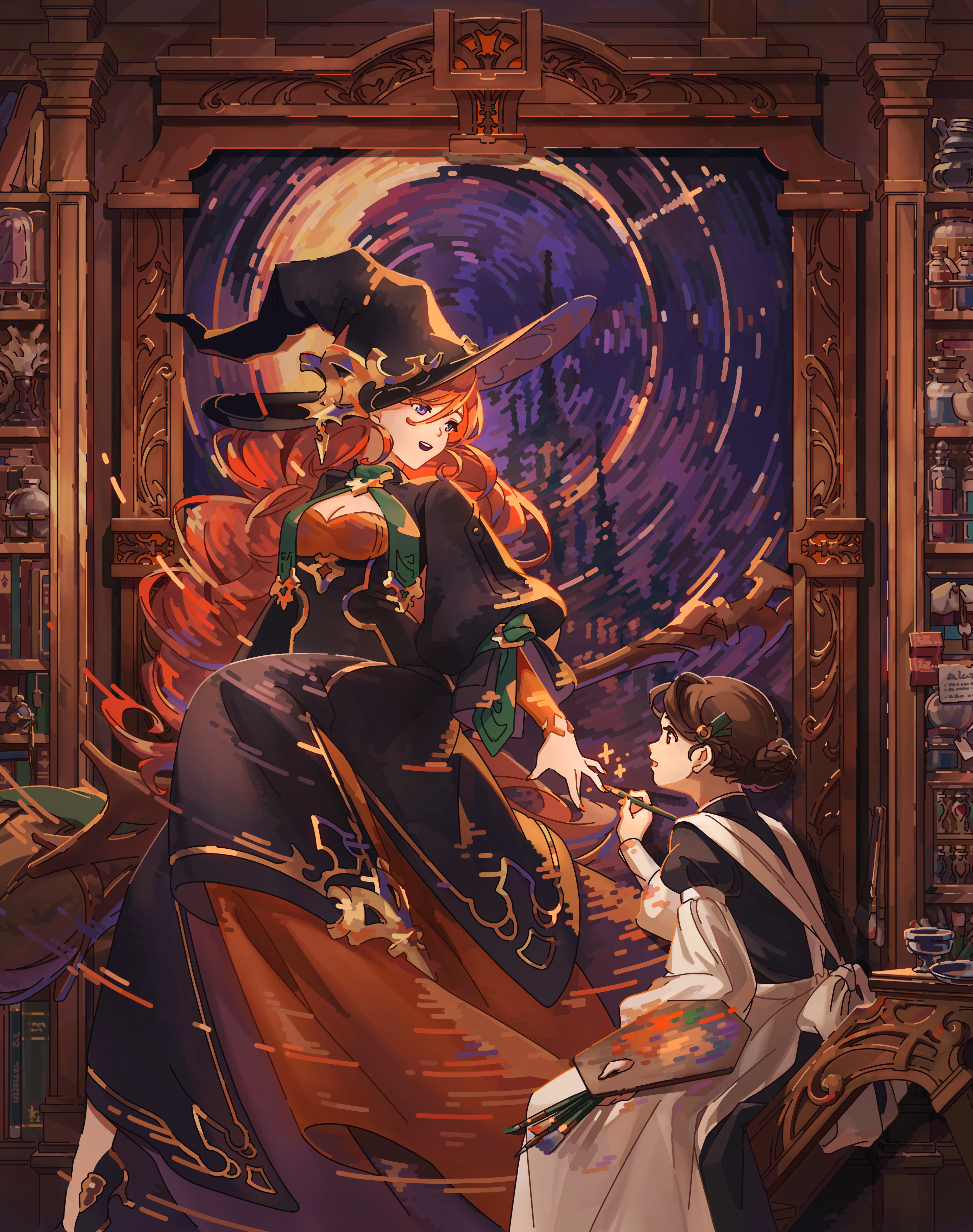 2girls absurdres applying_manicure apron black_dress black_hat black_jacket braid braided_bun breasts brown_hair castle cleavage commentary_request curly_hair dress hair_bun hat highres holding holding_paint_palette holding_paintbrush indoors jacket layered_dress layered_sleeves long_hair long_sleeves looking_at_another looking_to_the_side maid mia_arai000oj multiple_girls nail_polish open_clothes open_jacket open_mouth orange_dress orange_hair original paint_palette paintbrush painting_nails portal_(object) purple_eyes single_hair_bun sitting slice_of_life smile turning_head two-tone_dress very_long_hair white_apron witch witch_hat