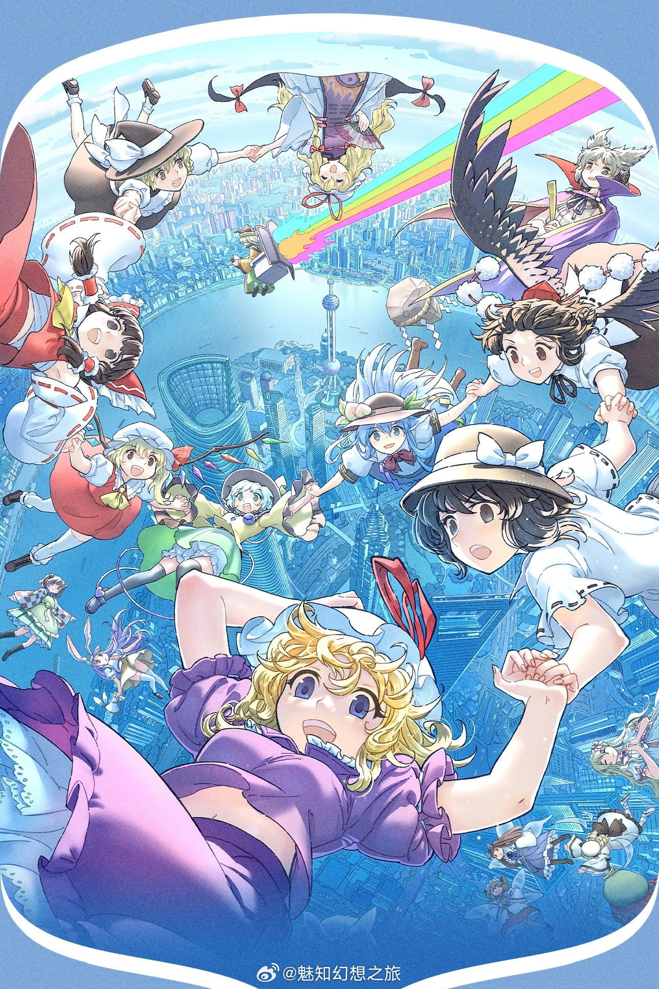 6+girls artist_request black_thighhighs blonde_hair blue_eyes blue_hair breasts brown_hair brown_hat building china chinese_commentary commentary_request detached_sleeves feathered_wings flandre_scarlet flying from_above gap_(touhou) green_skirt hair_ears hakurei_reimu hat highres hinanawi_tenshi holding_hands kaname-ishi kirisame_marisa kochiya_sanae komeiji_koishi looking_up luna_child maribel_hearn matara_okina midriff motoori_kosuzu multiple_girls nontraditional_miko purple_eyes purple_skirt red_skirt reisen_udongein_inaba river shameimaru_aya shanghai shirt shorts shorts_under_skirt skirt star_sapphire sunny_milk thighhighs tokin_hat touhou toyosatomimi_no_miko upside-down usami_renko watermark weibo_watermark white_hat white_shirt white_thighhighs wind wind_lift wings witch_hat yakumo_yukari