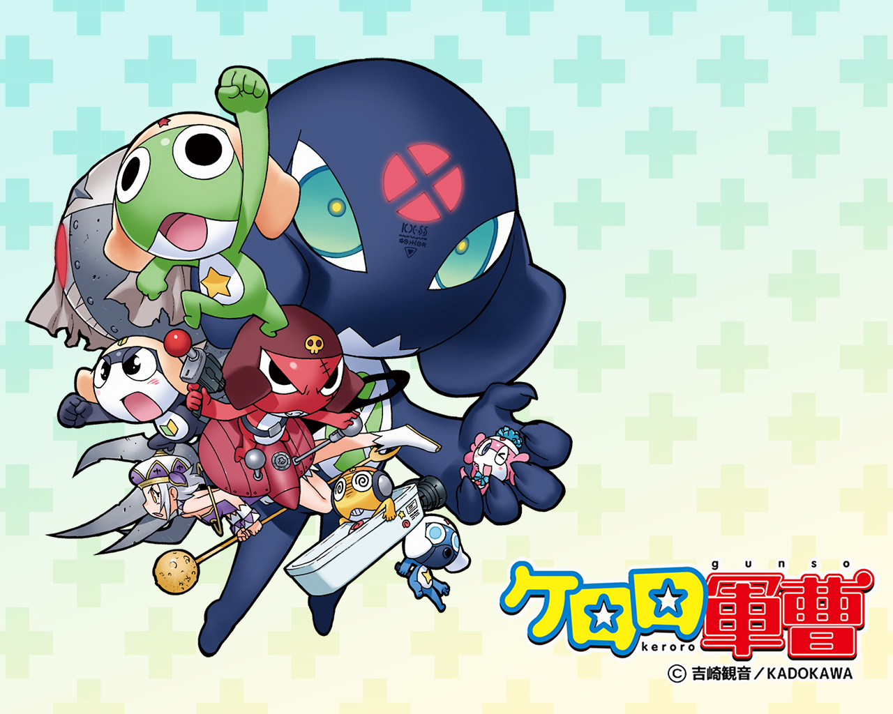 angol_mois belt black_eyes character_request copyright_name dororo_(keroro_gunsou) dress frog giroro glasses green_background grey_hair gun hat headphones keroro keroro_gunsou kururu_(keroro_gunsou) mask mouth_mask ninja_mask official_art official_wallpaper short_hair simple_background star_(symbol) tamama weapon yoshizaki_mine