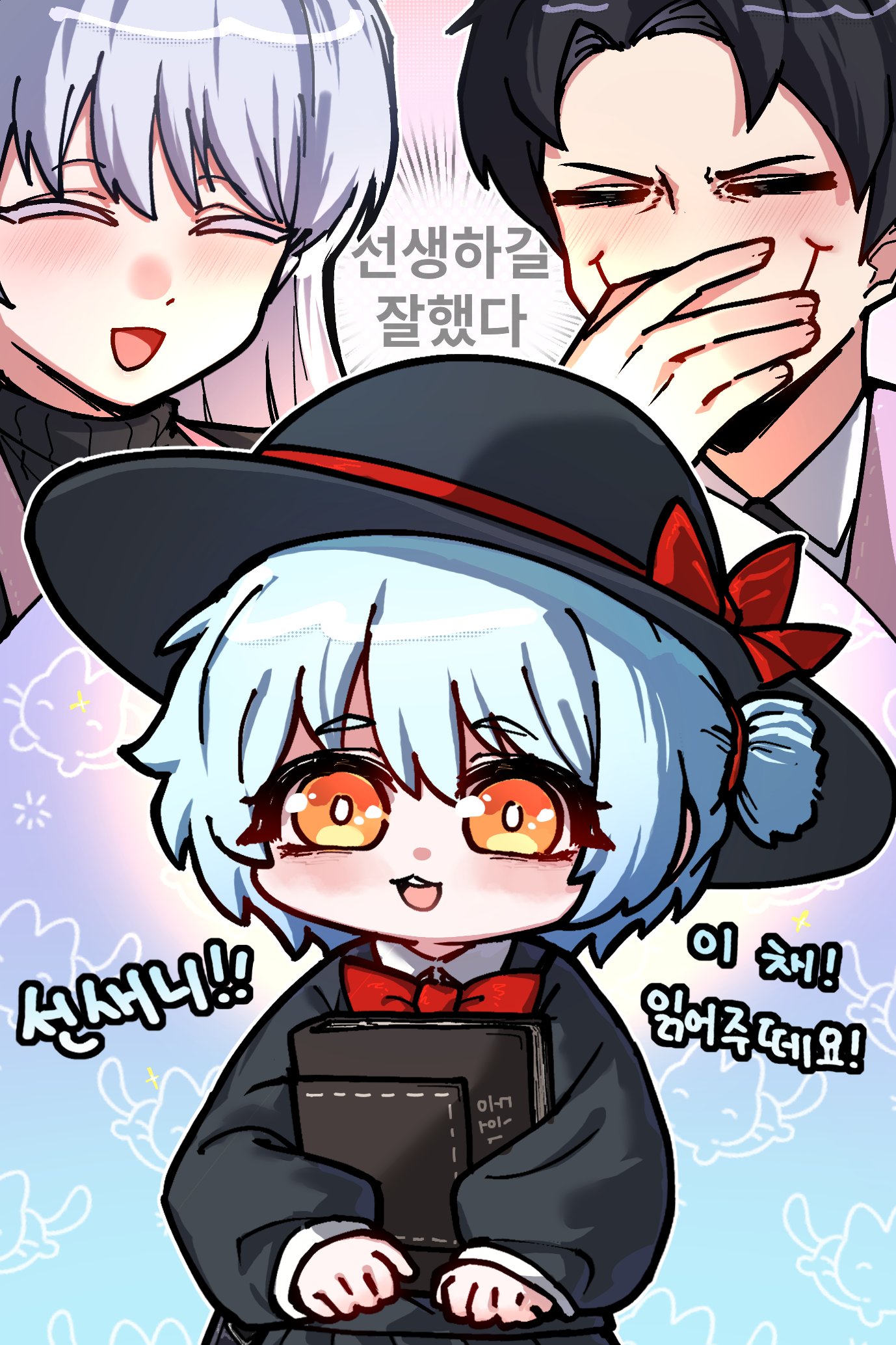 1boy 2girls :3 aged_down angela_(project_moon) angelica_(project_moon) black_hair black_hat black_shirt blue_hair bow closed_eyes closed_mouth commentary_request hat hat_bow highres jjong_(7_jjong_9) korean_text library_of_ruina limbus_company long_sleeves multiple_girls open_mouth project_moon puffy_long_sleeves puffy_sleeves red_bow roland_(project_moon) shirt short_hair smile stifled_laugh translation_request white_hair yellow_eyes