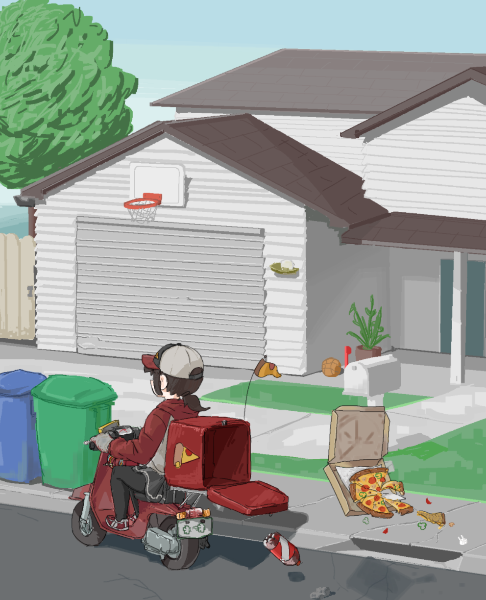 1girl ball baseball_cap basketball_(object) black_pantyhose brown_hair can cheese commentary_request day drink_can failure food grey_shorts hat highres hood hood_down hoodie house low_ponytail mailbox_(incoming_mail) motor_vehicle on_scooter original outdoors pantyhose pizza pizza_box pizza_slice plant ponytail potted_plant qoni321 red_hoodie road scooter shorts soda solo street trash_can tree