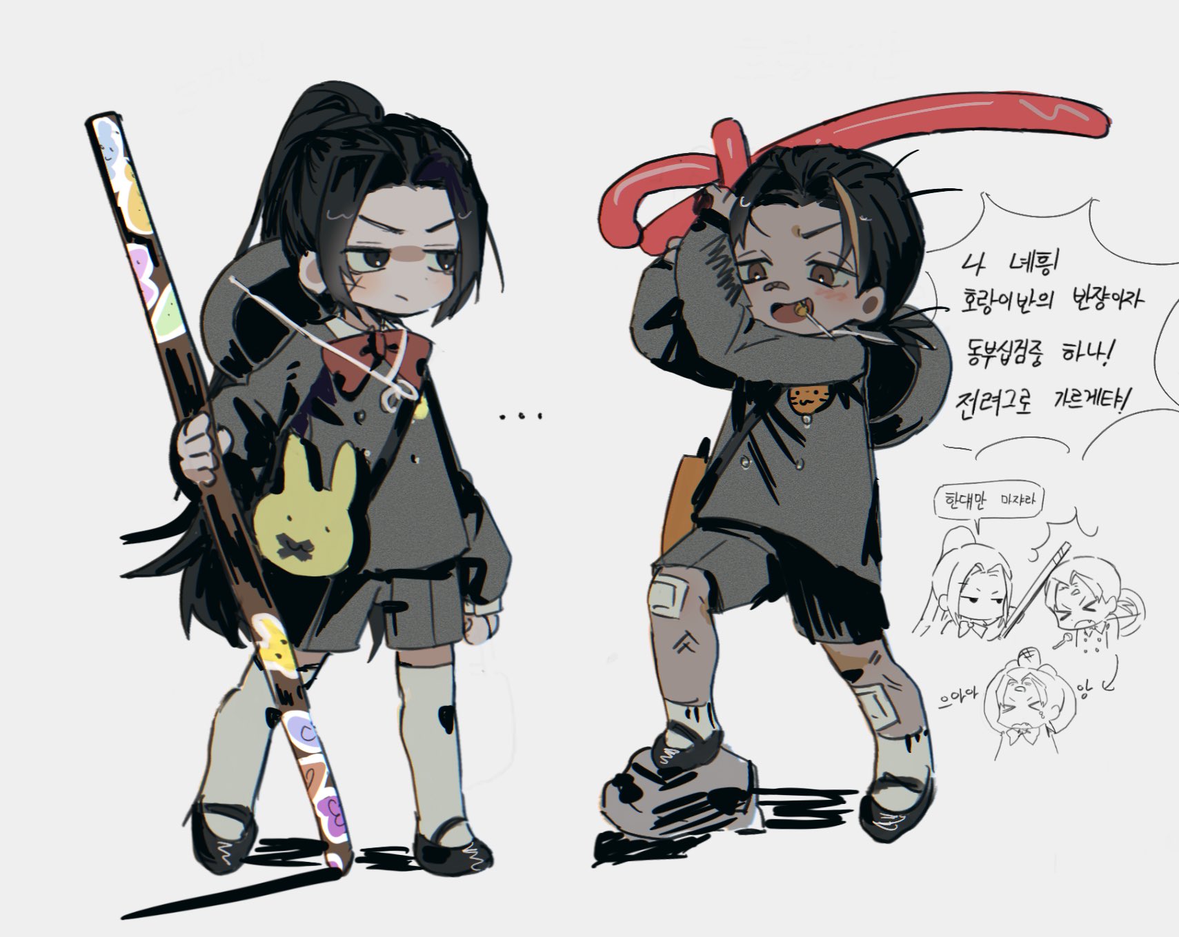 2boys aged_down arms_up balloon_sword black_eyes black_hair black_shirt black_shoes black_shorts blonde_streaks bow bowtie brown_eyes brown_hair chanil_(muexlku) closed_mouth commentary_request expressionless highres holding holding_staff jia_qiu_(project_moon) kindergarten_uniform korean_commentary korean_text lei_heng_(project_moon) limbus_company multicolored_hair multiple_boys open_mouth parted_bangs project_moon red_bow red_bowtie shirt shoes shorts smile socks staff streaked_hair translation_request white_socks