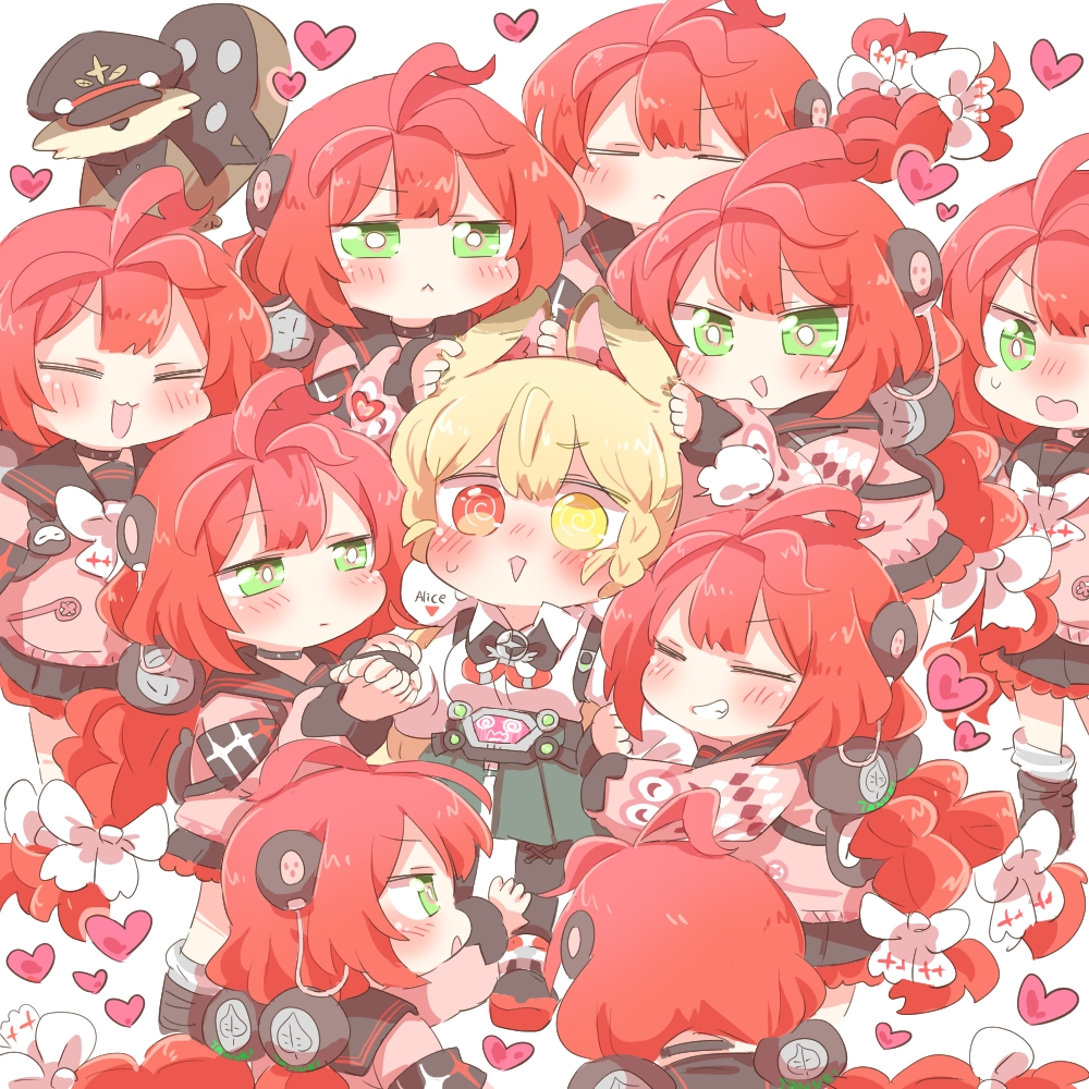 6+girls :3 :d @_@ alice_thymefield animal_ears blonde_hair blush braid braided_twintails cardigan chest_bow clone clone_harem closed_eyes commentary_request green_eyes hair_ornament hearing_aid heart heterochromia kamanosuke_(zenless_zone_zero) long_hair long_sleeves low_twin_braids multiple_girls open_mouth pink_cardigan rabbit_ears rabbit_girl raccoon rebecca_(keinelove) red_eyes red_hair simple_background smile sphere_hair_ornament tanuki twin_braids twintails ukinami_yuzuha white_background yellow_eyes zenless_zone_zero