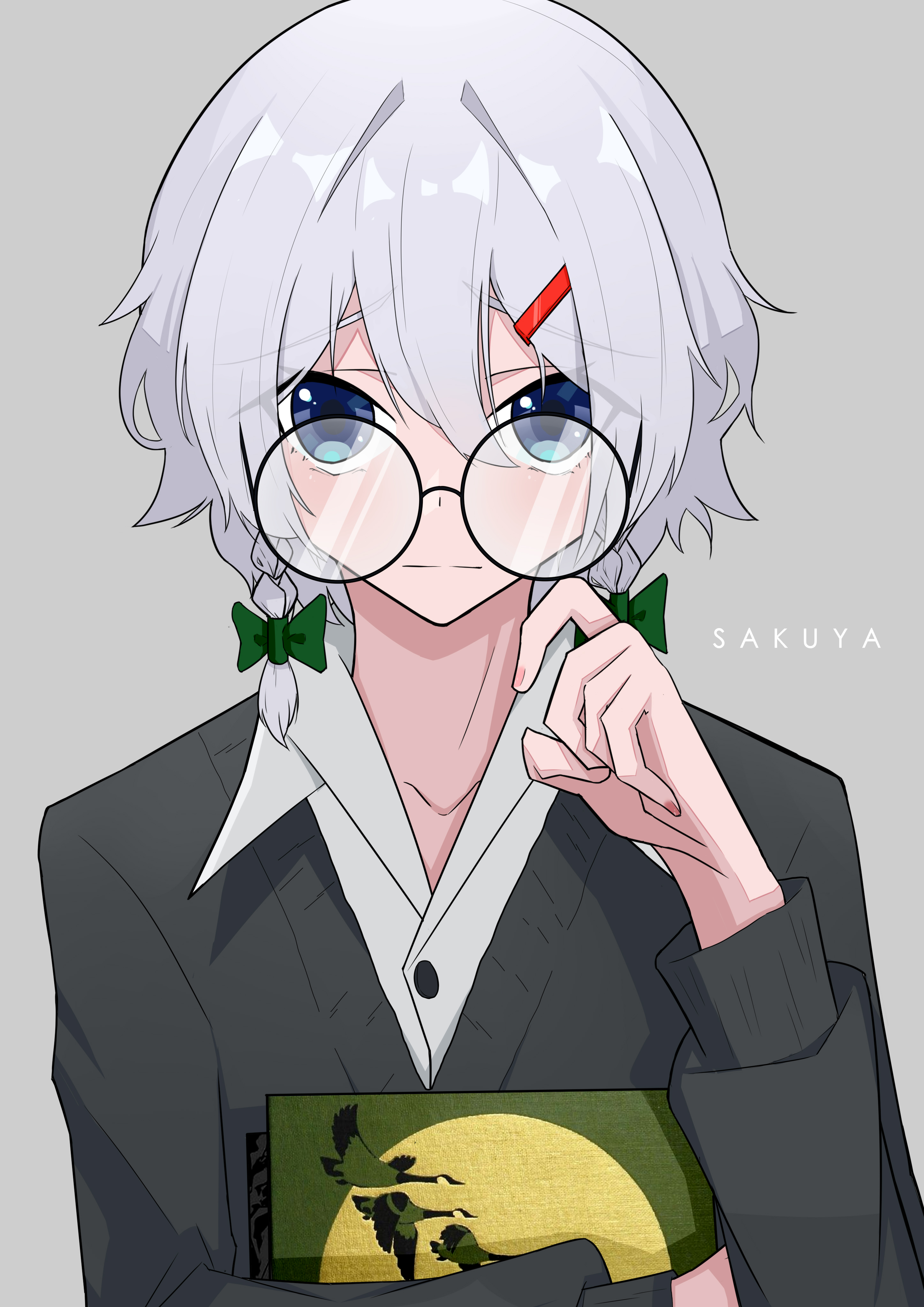 1girl absurdres adjusting_eyewear black-framed_eyewear black_sweater blue_eyes book bow braid buttons closed_mouth collared_shirt commentary_request dress_shirt glasses green_bow grey_background grey_hair hair_between_eyes hair_bow hand_up highres holding holding_book izayoi_sakuya long_sleeves looking_at_viewer puffy_long_sleeves puffy_sleeves round_eyewear shirt short_hair simple_background solo sweater touhou twin_braids upper_body white_shirt yvkiki