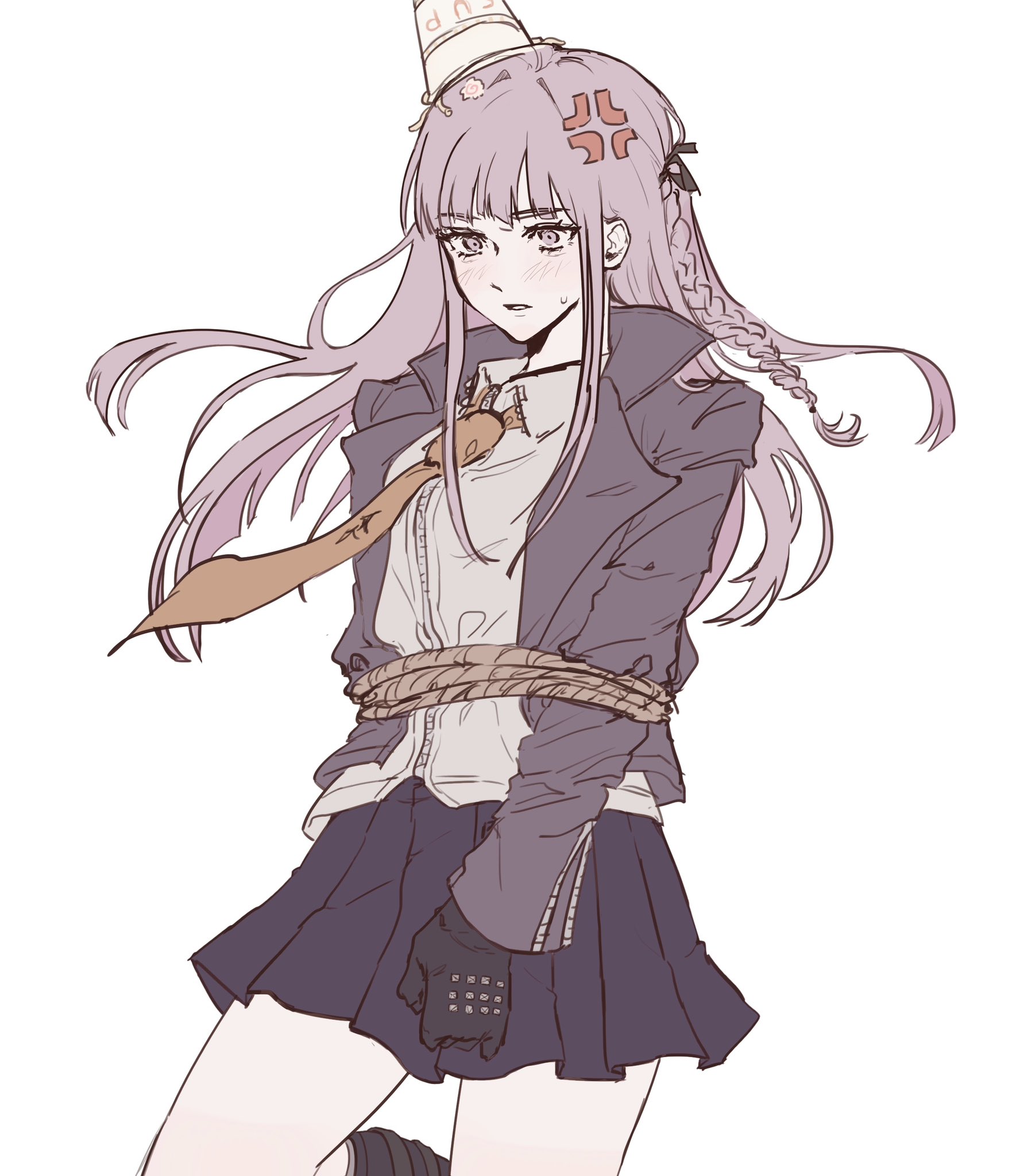 1girl anger_vein black_gloves blush braid commentary_request danganronpa:_trigger_happy_havoc danganronpa_(series) food food_on_head gloves hair_ribbon highres jacket kirigiri_kyoko korean_commentary long_hair long_sleeves necktie object_on_head open_clothes open_jacket pink_hair restrained ribbon rope shirt side_braid simple_background skirt solo sweatdrop teeth tkddj white_background
