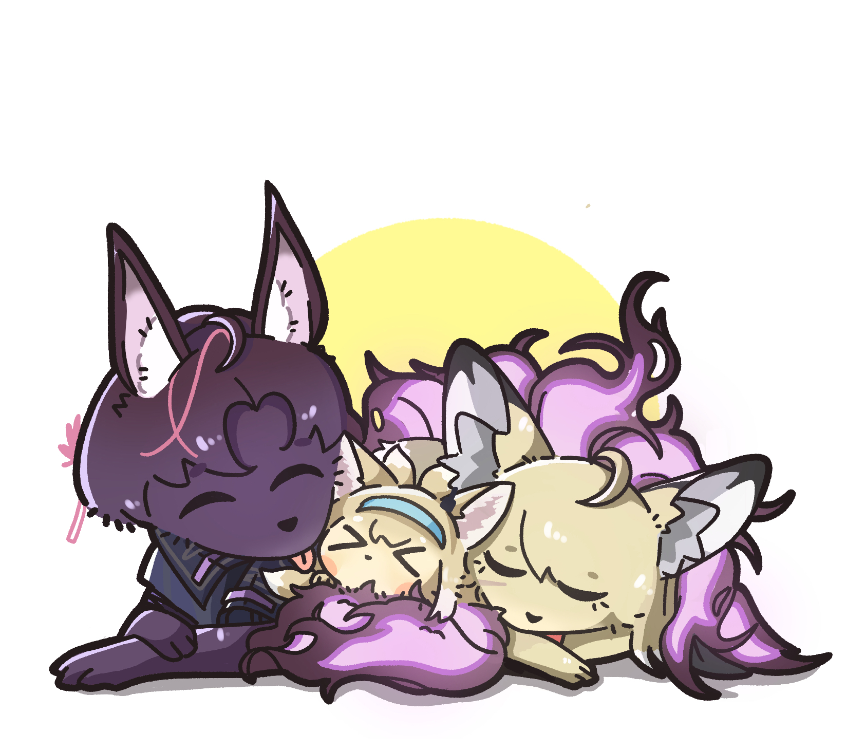 >_< animalization arknights banbon blue_hairband closed_eyes commentary fox hairband highres kitsune kyuubi multiple_tails suzuran's_father_(arknights) suzuran_(arknights) tail untranslatable_commentary vulpisfoglia_(arknights)