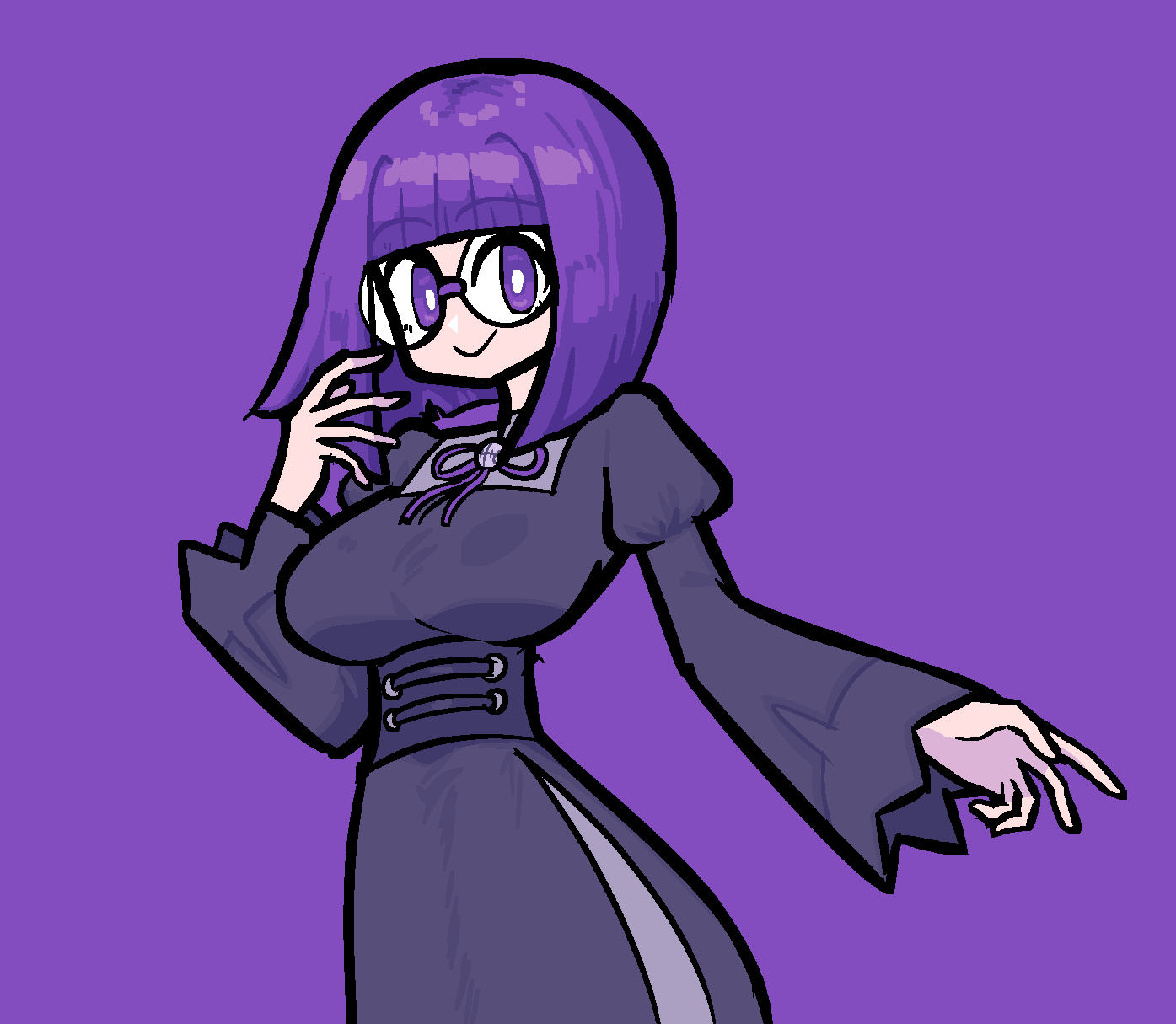 1girl black_corset black_dress blunt_bangs bob_cut breasts corset cosplay dress glasses hex_maniac_(pokemon) hex_maniac_(pokemon_legends:_z-a) hex_maniac_(pokemon_legends:_z-a)_(cosplay) highres juliet_sleeves large_breasts long_sleeves medium_breasts medium_hair nintendo pokemon pokemon_black_and_white pokemon_legends:_z-a puffy_sleeves purpienamako purple_dress purple_hair rimless_eyewear round_eyewear shauntal_(pokemon)