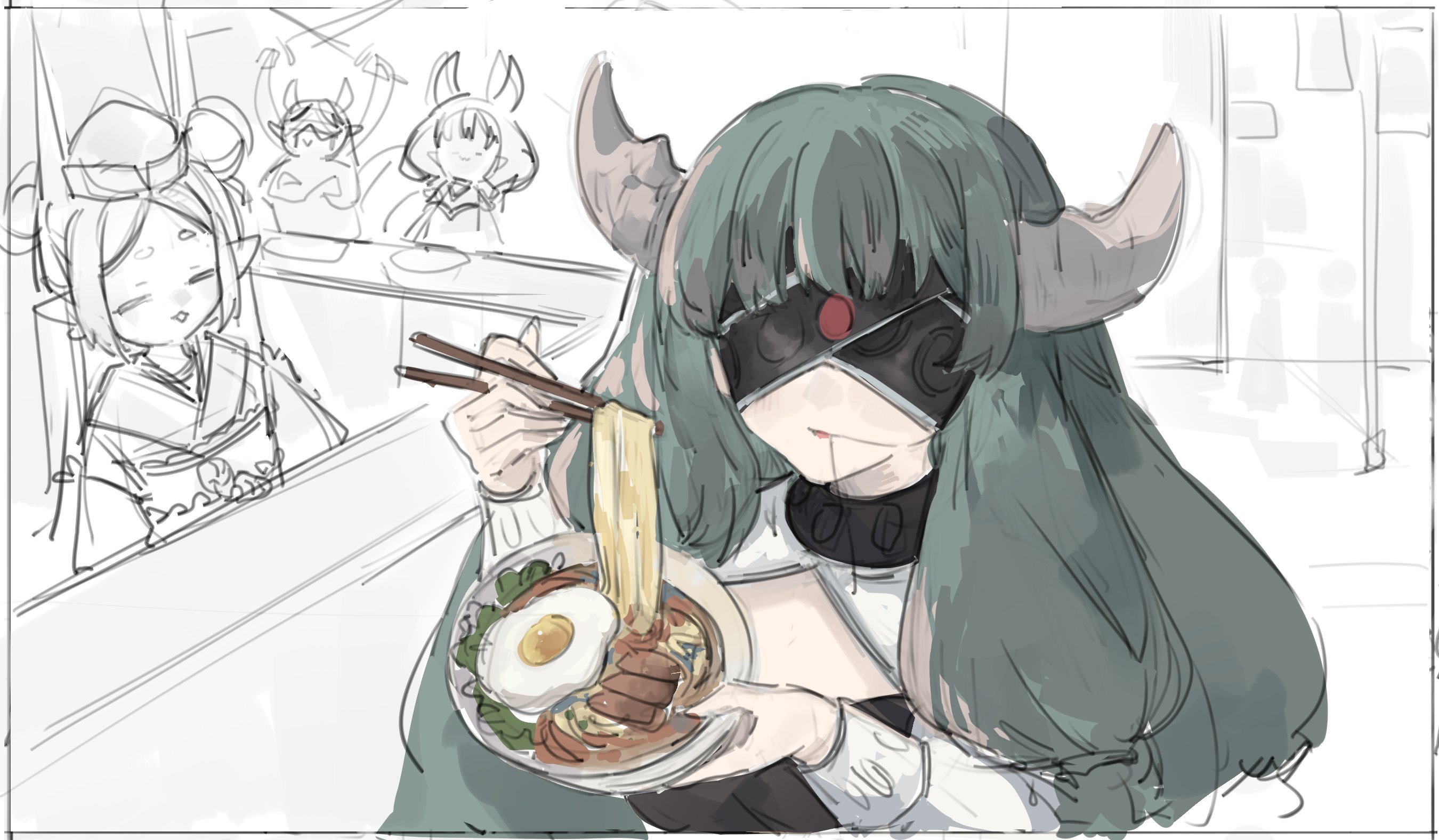 1boy 3girls aura_(sousou_no_frieren) black_choker blindfold blindfold_mask braid choker chopsticks demon demon_boy demon_girl demon_horns divine_revolte_(sousou_no_frieren) egg elf food frieren green_hair highres holding holding_chopsticks horns long_hair mask meat multiple_braids multiple_girls noodles pointy_ears ramen sae1624 scrambled_egg sousou_no_frieren white_background zorida_(sousou_no_frieren)
