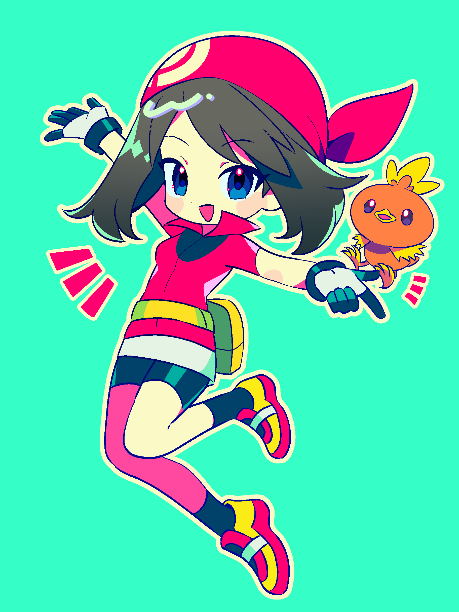 1girl :d absurdres bag bandana bike_shorts bike_shorts_under_skirt black_socks blue_eyes blush_stickers brown_hair chibi chibi_only collared_shirt commentary_request ebi_(shrimp_eleven) fanny_pack gen_3_pokemon gloves green_background highres looking_at_viewer may_(pokemon) medium_hair nintendo open_mouth outline pokemon pokemon_(creature) pokemon_ruby/sapphire/emerald red_bandana red_shirt shirt shoes short_sleeves shout_lines skirt smile socks torchic white_skirt yellow_bag yellow_shoes