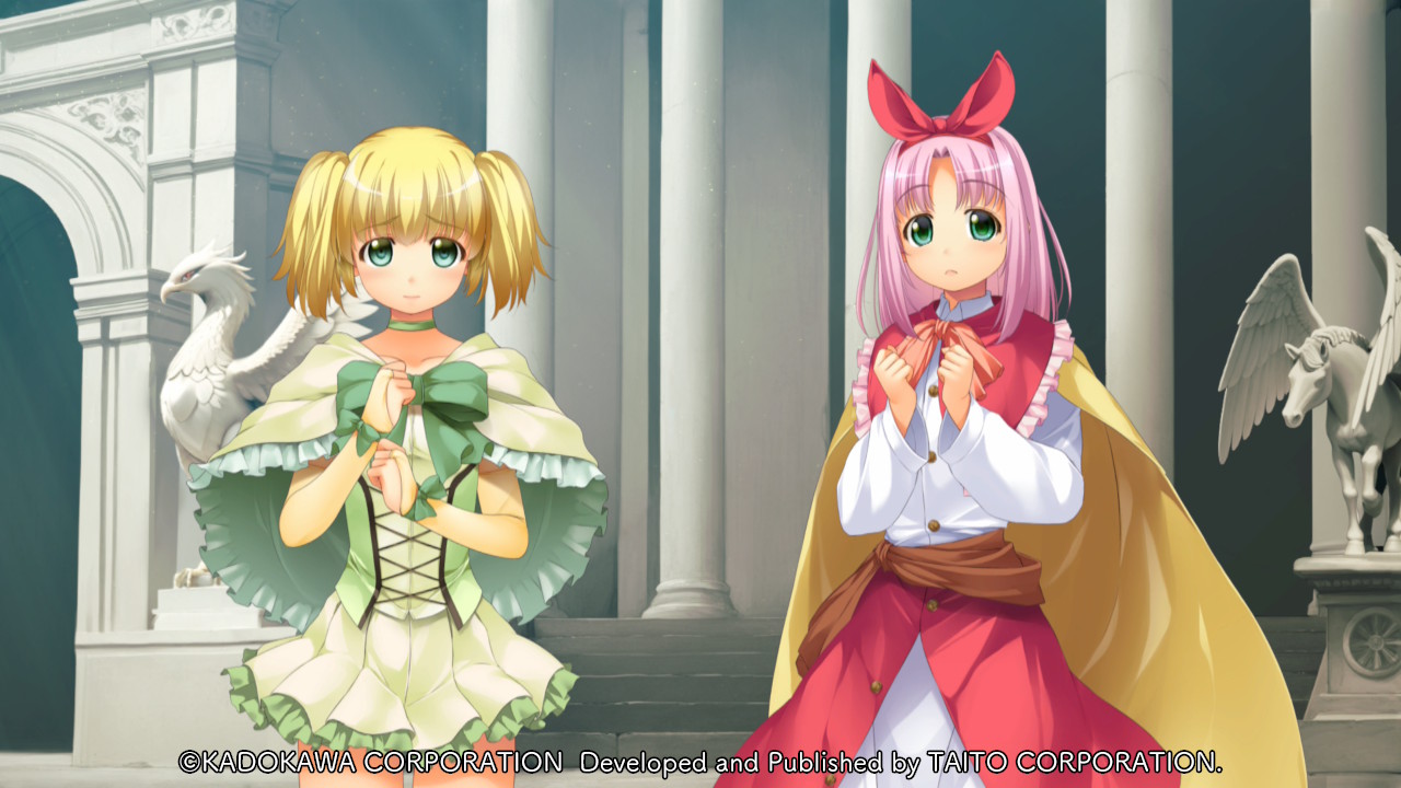 2girls :< atelier-moo bird blonde_hair bow breasts bridal_gauntlets building capelet choker clenched_hands closed_mouth collarbone collared_shirt corset cowboy_shot curtained_hair elbow_gloves flat_chest frilled_capelet frills game_cg gloves green_bow green_capelet green_choker green_eyes green_shirt hair_between_eyes hairband hands_on_own_chest horse_statue laura_newfield_(revival) long_hair long_skirt long_sleeves looking_at_viewer maria_short_(revival) medium_hair miniskirt multiple_girls non-web_source official_art parted_bangs pillar pink_hair pink_ribbon pleated_skirt raised_inner_eyebrows red_capelet red_hairband ribbon shirt short_twintails side-by-side sidelocks skirt small_breasts standing statue strapless strapless_shirt tareme twintails wavy_mouth yellow_gloves yuukyuu_gensoukyoku yuukyuu_gensoukyoku_revival