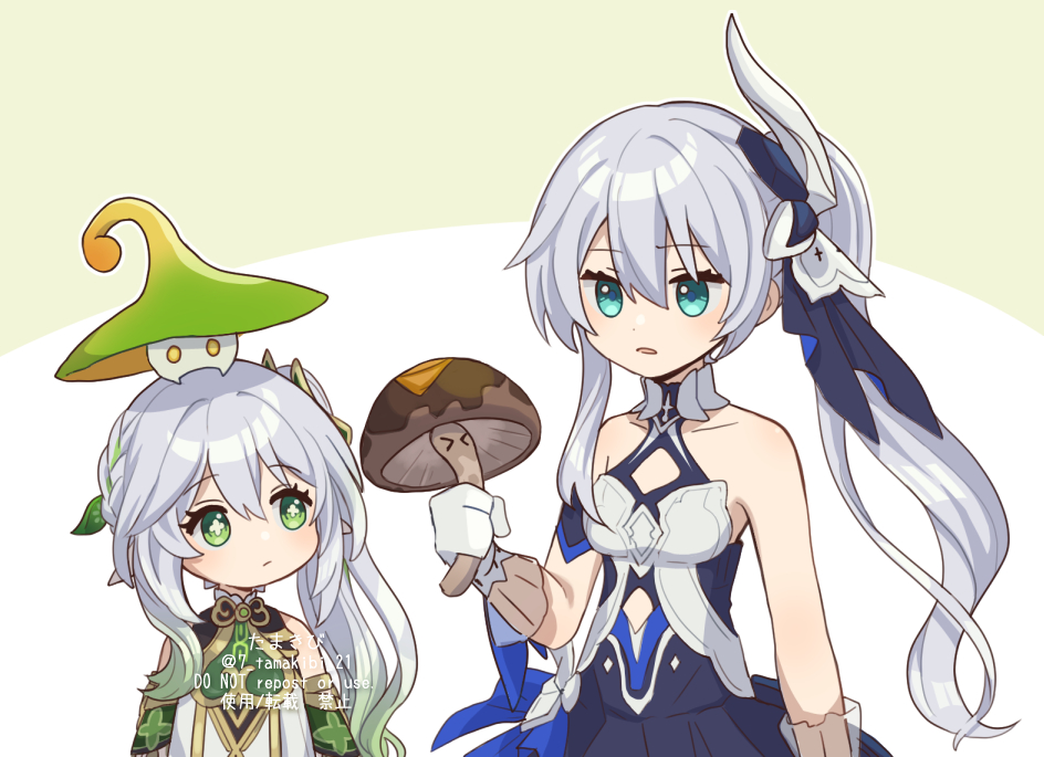 2girls aqua_eyes bare_arms bare_shoulders blue_dress breasts closed_mouth commentary_request corn_kuten crossover dot_nose dress flat_chest fungi_(genshin_impact) genshin_impact gloves green_eyes green_hair grey_hair hair_between_eyes hair_ornament holding honkai_(series) honkai_impact_3rd hualing long_hair looking_at_another mihoyo multicolored_hair multiple_girls mushroom nahida_(genshin_impact) parted_lips pointy_ears ponytail shiitake simple_background small_breasts streaked_hair tamura_yukari theresa_apocalypse theresa_apocalypse_(twilight_paladin) upper_body voice_actor_connection white_gloves