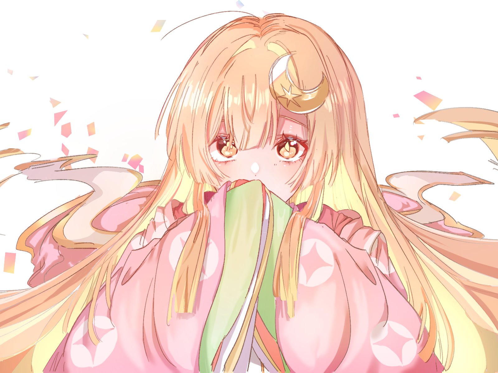 1girl blonde_hair brown_eyes cho_kaguya-hime! commentary_request crescent crescent_hair_ornament hair_ornament highres japanese_clothes kaguya_(cho_kaguya-hime!) kimono long_hair looking_at_viewer lua_1123 pink_kimono side_ponytail solo very_long_hair white_background