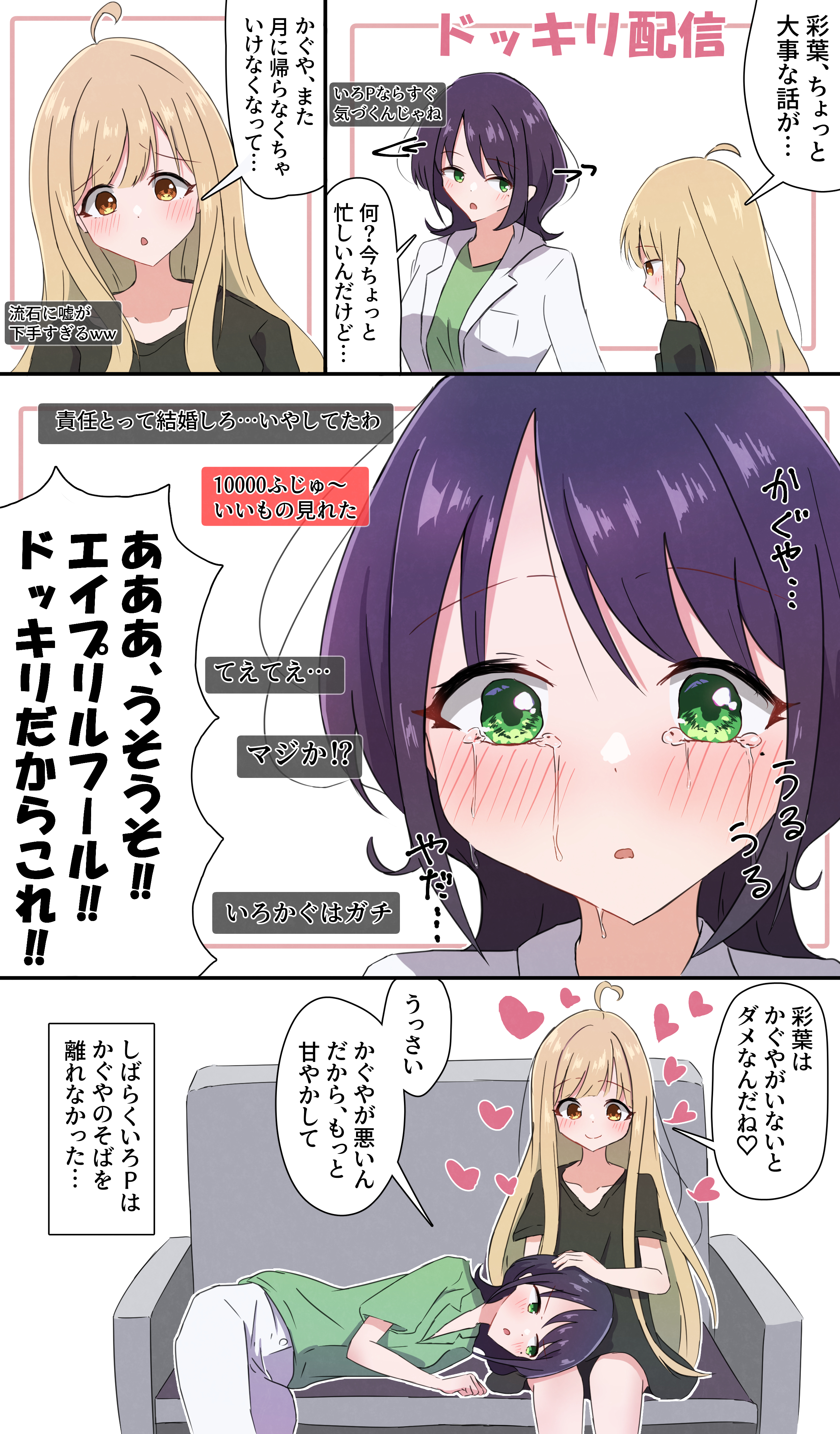 2girls absurdres ahoge april_fools black_shirt blonde_hair blush breast_pocket chat_log cho_kaguya-hime! collarbone commentary_request couch crying crying_with_eyes_open green_eyes green_shirt hand_on_another's_head hasakana heart heart_ahoge highres kaguya_(cho_kaguya-hime!) lab_coat lap_pillow long_hair looking_at_another medium_hair mole mole_under_eye multiple_girls open_mouth pocket purple_hair sakayori_iroha shirt short_sleeves sitting smile tears translation_request yuri