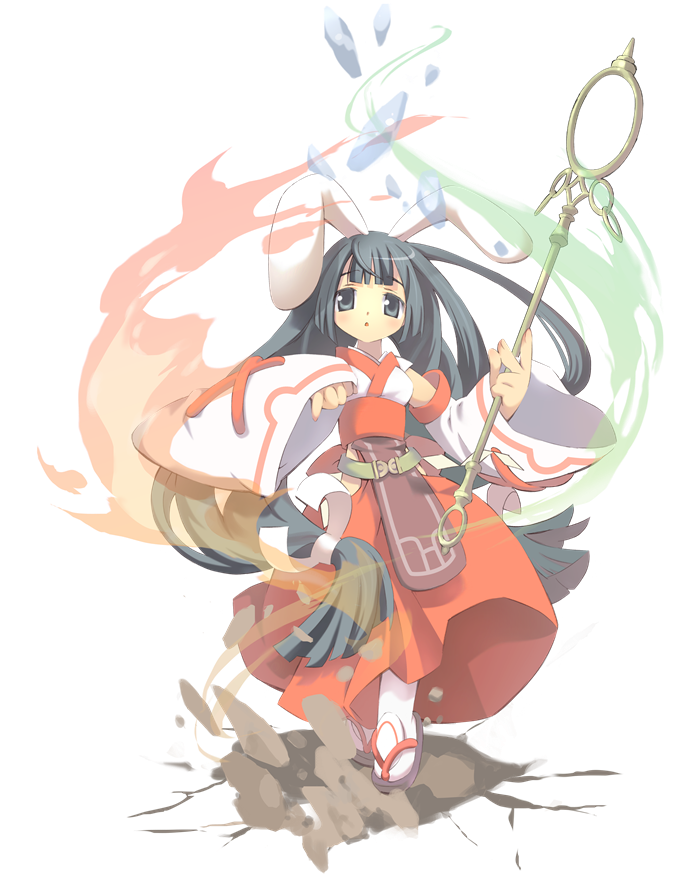 1girl animal_ear_hairband animal_ears black_eyes black_hair clothing_cutout detached_sleeves elementalist_(eco) emil_chronicle_online fake_animal_ears fire hairband hanehane_kiro hip_vent holding holding_staff ice japanese_clothes long_hair low_twintails miko official_art okobo pants pantyhose platform_sandals rabbit_ear_hairband rabbit_ears red_pants red_sash sandals sash shakujou solo staff twintails white_background white_pantyhose white_sleeves wide_sleeves wind