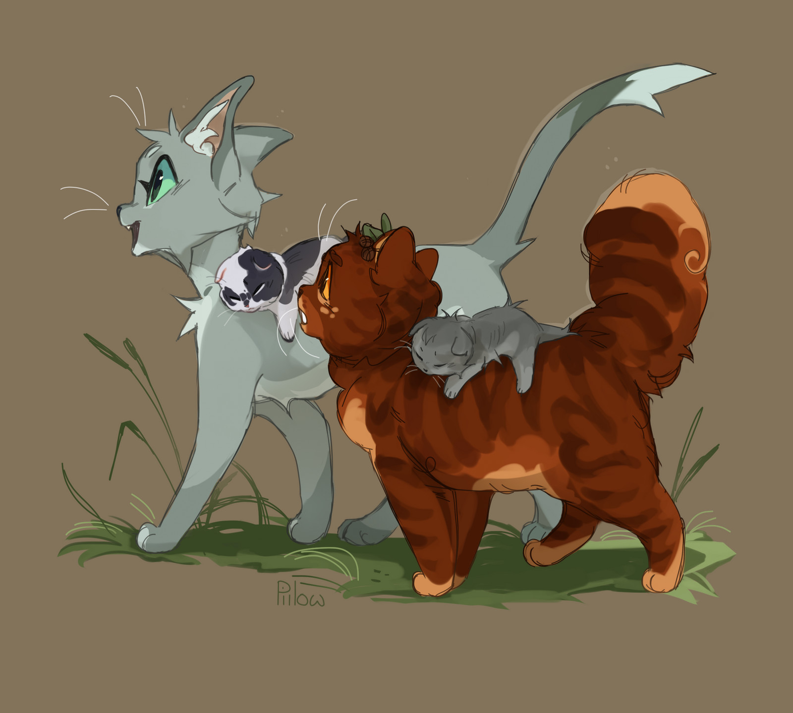 a_vision_of_shadows alderheart animal animal_focus baby_animal brown_background brown_cat cat commentary english_commentary freckles from_side full_body grass graypillow green_eyes grey_cat highres kitten looking_at_another needletail no_humans open_mouth orange_eyes standing tabby_cat twigbranch violetshine warrior_cats whiskers