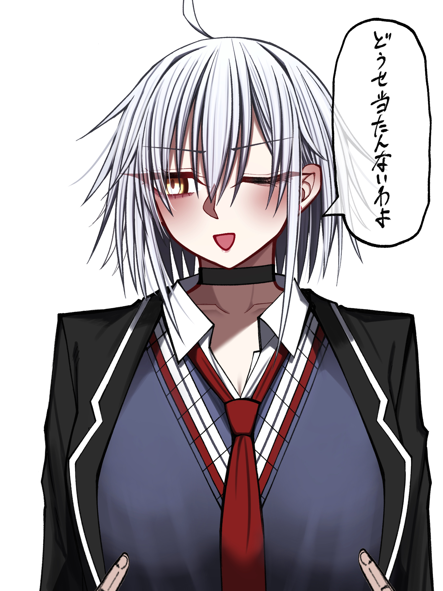 1boy 1girl ahoge black_shirt blue_shirt blush collarbone command_spell commentary_request disembodied_hand fate/grand_order fate_(series) fujimaru_ritsuka_(male) highres jeanne_d'arc_alter_(fate) looking_at_viewer mcpc_zamurai meme necktie nipple_guessing_game_(meme) one_eye_closed red_necktie school_uniform shirt short_hair white_hair yellow_eyes