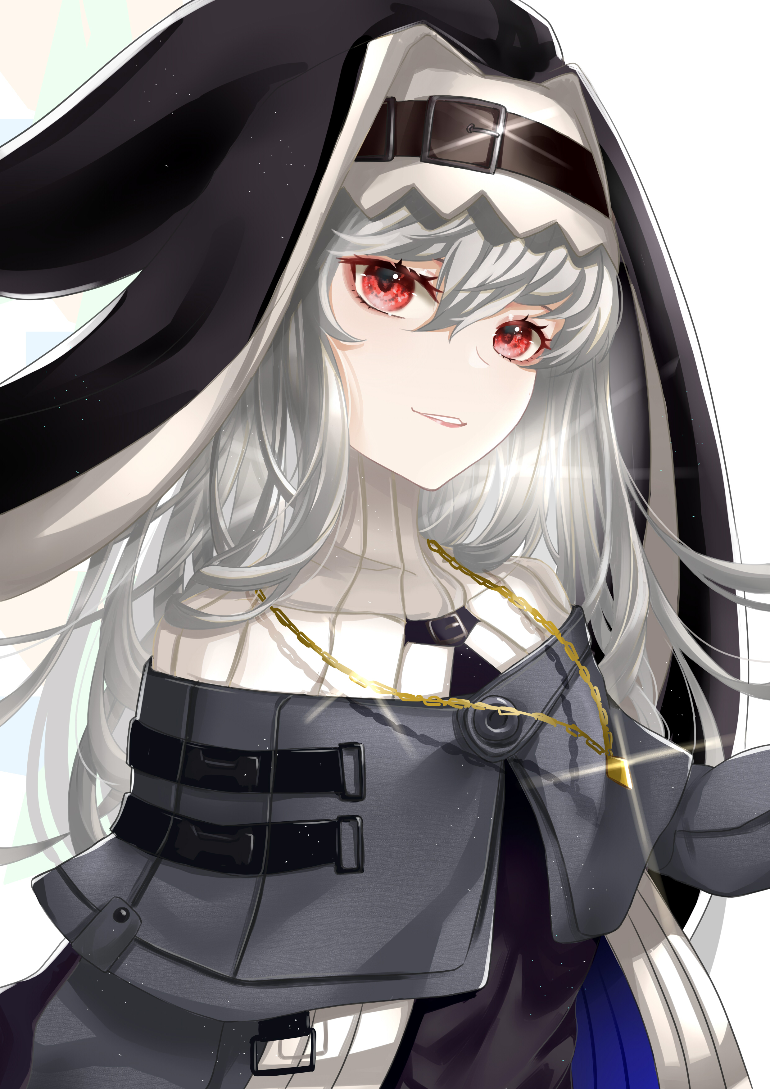 1girl absurdres arknights belt black_belt black_dress black_veil commentary_request dress grey_hair hair_between_eyes highres jewelry long_hair looking_at_viewer necklace nun parted_lips philosophia red_eyes simple_background smile solo specter_(arknights) upper_body veil white_background