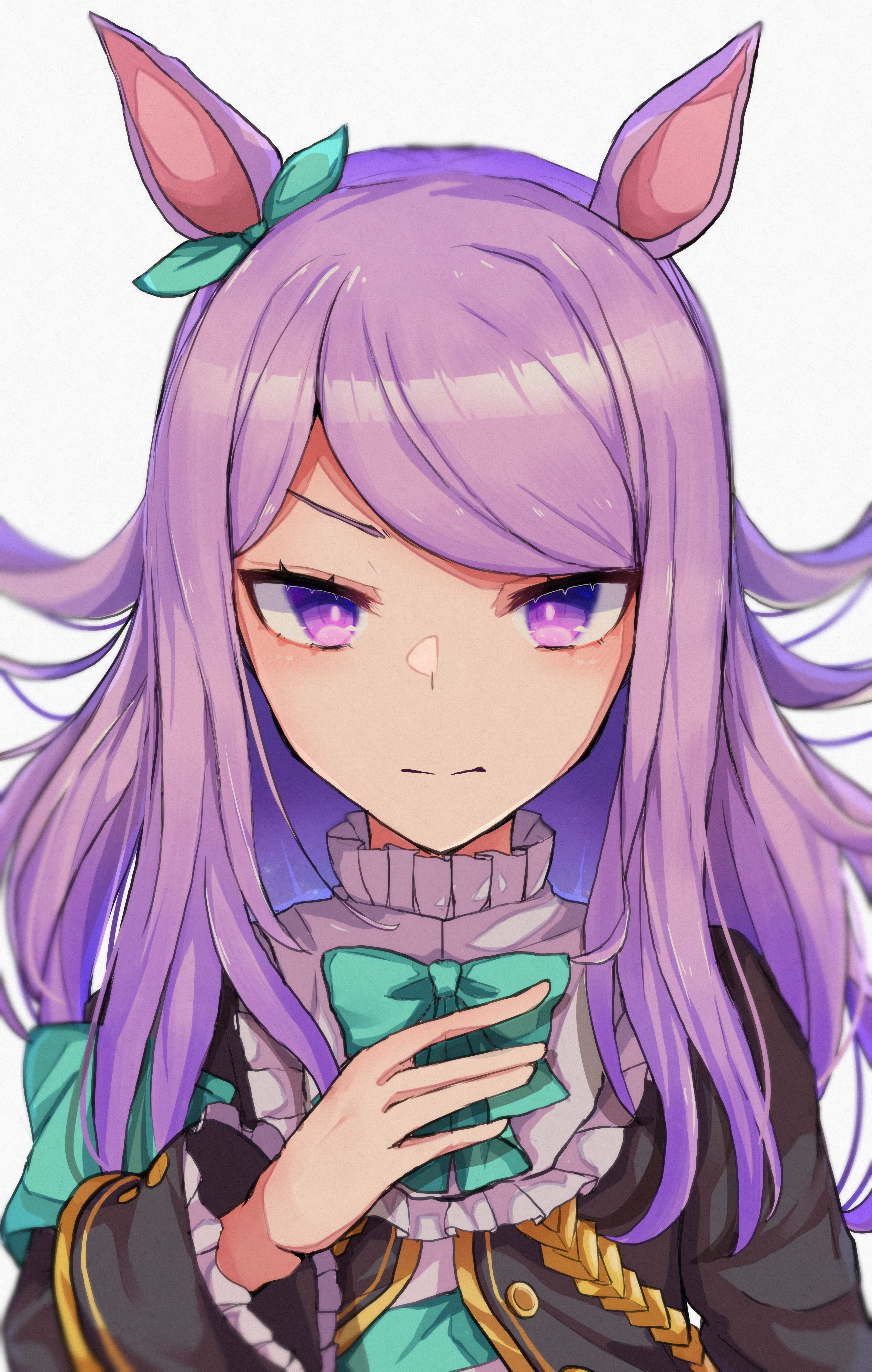 1girl absurdres animal_ears aqua_bow armband black_jacket blue_armband blush bow bowtie closed_mouth coat commentary_request ear_bow ear_ribbon frilled_coat frilled_jacket frills highres horse_ears horse_girl jacket long_hair long_sleeves looking_at_viewer mejiro_mcqueen_(frontline_elegance)_(umamusume) mejiro_mcqueen_(umamusume) purple_eyes purple_hair ribbon simple_background solo umamusume upper_body white_background yozakura_rakuza