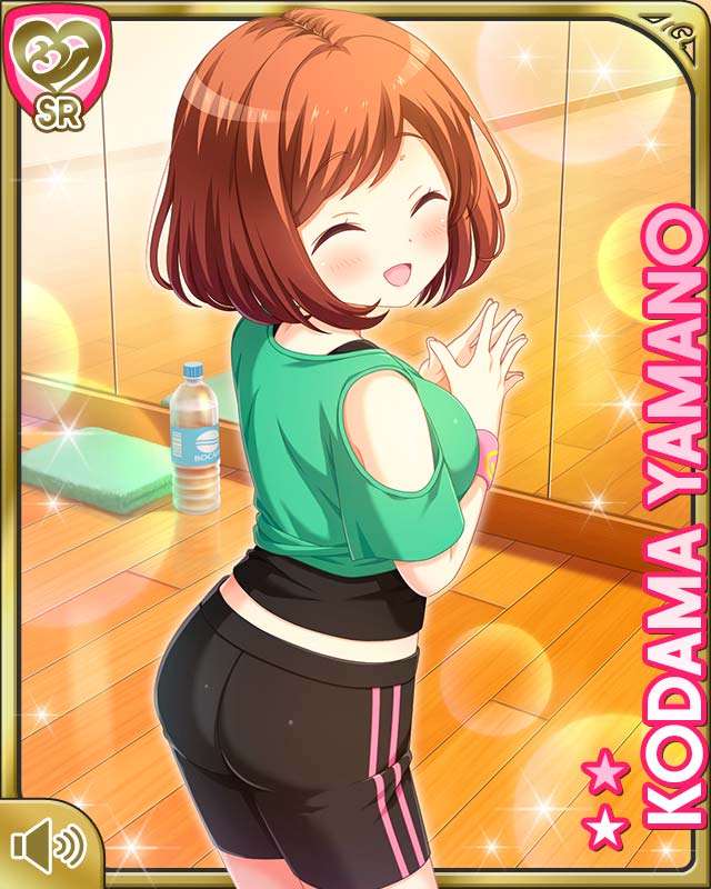 1girl :d bare_arms bare_legs black_shirt black_shorts brown_eyes brown_hair card character_name closed_eyes day girlfriend_(kari) green_tank_top indoors official_art open_mouth qp:flapper shirt shorts smile solo standing tagme tank_top workout_clothes yamano_kodama