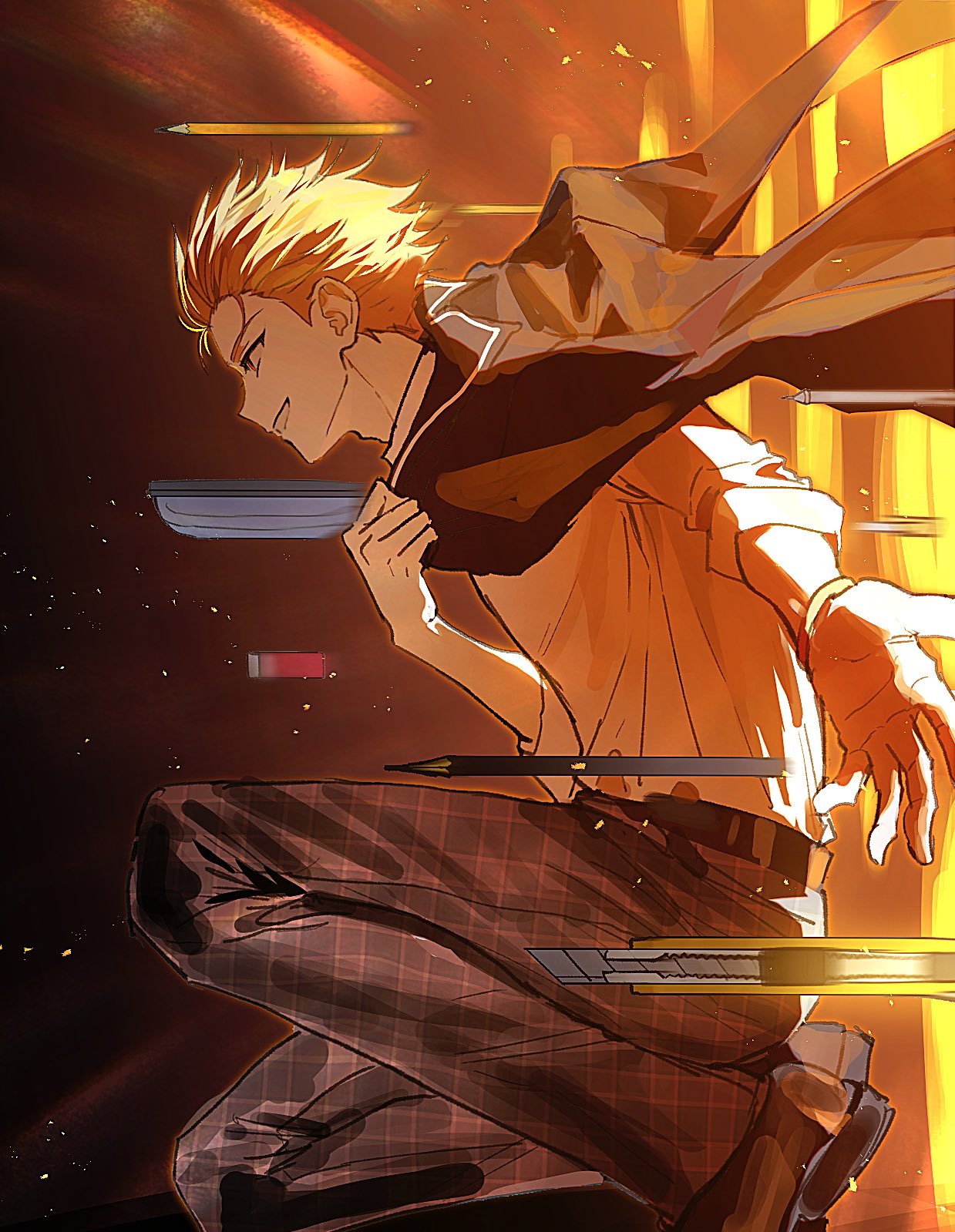 1boy backlighting belt black_background black_belt black_jacket black_shoes blonde_hair boxcutter bracelet clothes_grab commentary_request empty_eyes eraser fate/stay_night fate/unlimited_blade_works fate_(series) floating_clothes flying from_side full_body gate_of_babylon_(fate) gilgamesh_(fate) gilgamesh_(immoral_biker_jacket)_(fate) gold_bracelet gold_ring grey_pants highres jacket jewelry korean_commentary lamyeongood lapels long_sleeves looking_to_the_side magic male_focus official_alternate_costume open_clothes open_jacket pants pen pencil plaid_clothes plaid_pants portal_(object) red_eyes shirt shoes short_hair smile solo spiked_hair teeth white_shirt