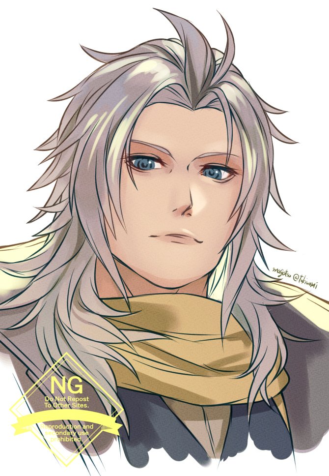 1boy black_vest blue_eyes closed_mouth coat commentary_request denka_(cloudy-gray) dissidia_duellum_final_fantasy dissidia_final_fantasy final_fantasy final_fantasy_i grey_coat grey_hair grey_shirt looking_at_viewer male_focus medium_hair official_alternate_costume parted_bangs portrait scarf shirt solo twitter_username vest warrior_of_light_(ff1) warrior_of_light_(twilight_overcoat)_(ff1) white_background yellow_scarf