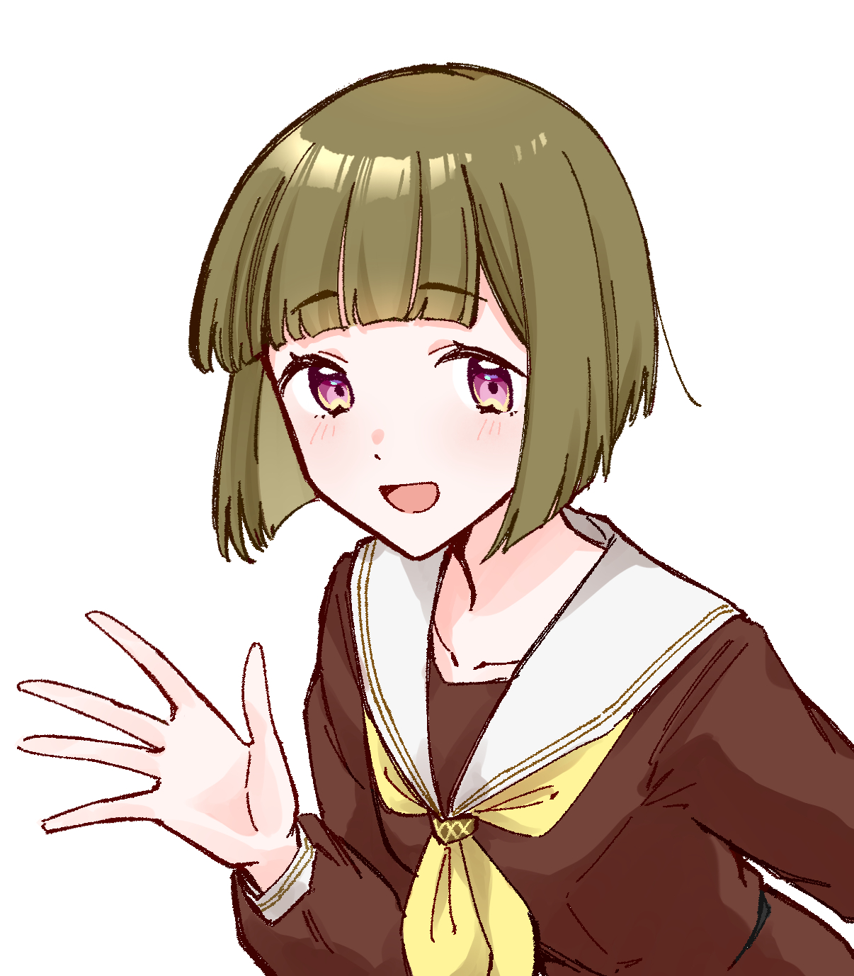 1girl :d alternate_hair_length_(shorter) blunt_bangs blush bob_cut brown_dress dress hasu_no_sora_school_uniform highres inverted_bob kachimachi_kosuzu link!_like!_love_live! long_sleeves looking_at_viewer love_live! neckerchief official_alternate_hairstyle open_hand open_mouth pink_eyes sailor_collar sailor_dress school_uniform short_hair simple_background smile solo virtual_youtuber waving white_background white_sailor_collar winter_uniform yellow_neckerchief zangemiya