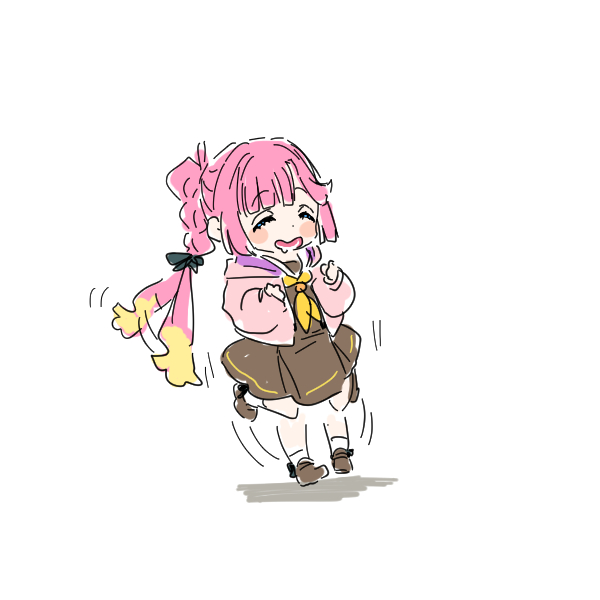 1girl :d ahoge anyoji_hime black_ribbon blonde_hair blush_stickers brown_dress brown_shoes commentary_request deformed dress drooling facing_viewer full_body gradient_hair hair_ribbon hasu_no_sora_school_uniform hood hooded_jacket jacket jumping link!_like!_love_live! long_sleeves love_live! medium_dress mouth_drool multi-tied_hair multicolored_hair neckerchief open_clothes open_jacket open_mouth pink_hair pink_jacket pleated_dress ponytail ribbon sailor_collar sailor_dress school_uniform shinanoya_(satanicad) shoes sidelocks smile socks solo virtual_youtuber white_sailor_collar white_socks winter_uniform yellow_neckerchief
