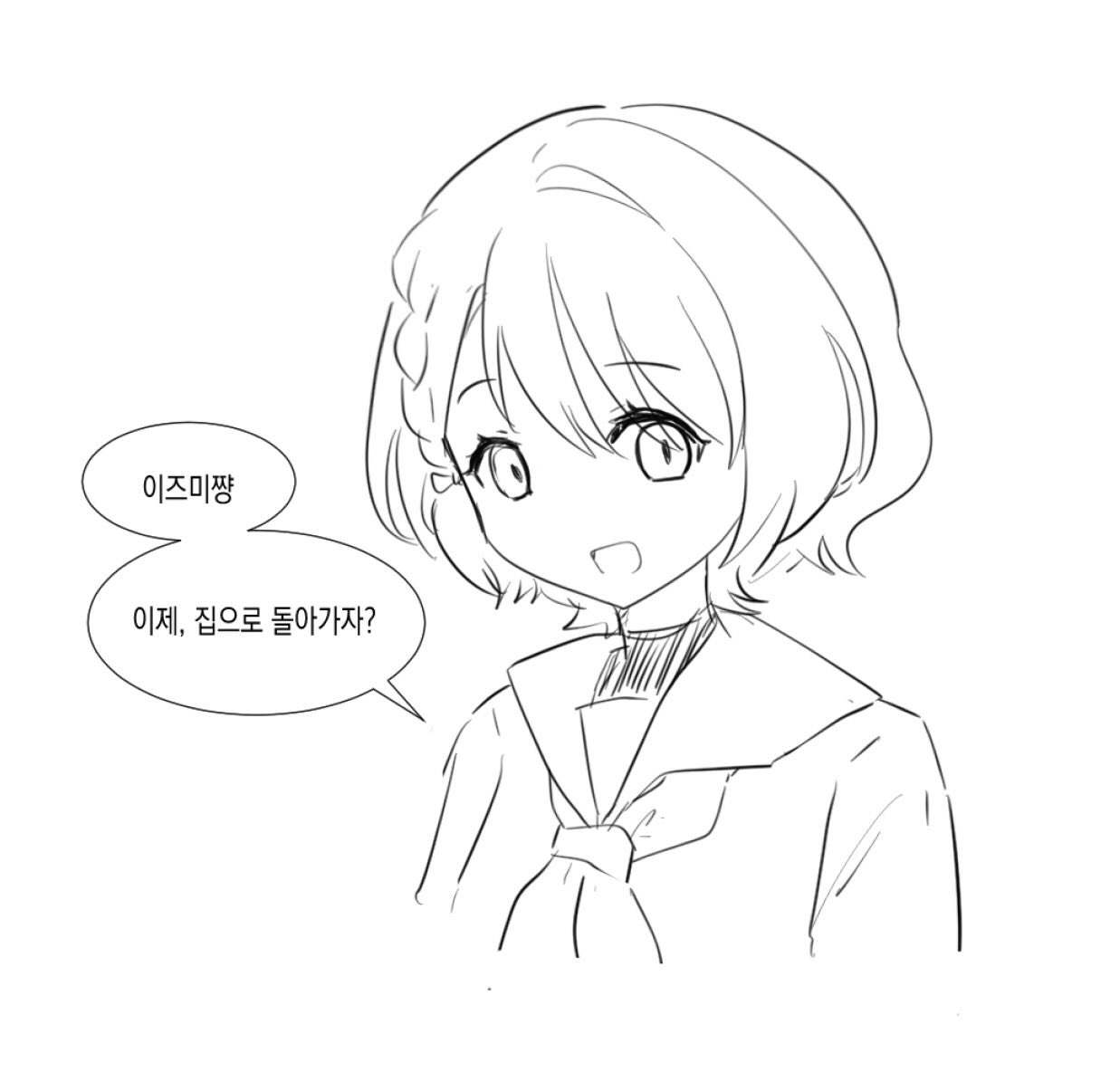 1girl :d braid churhami commentary_request dress flipped_hair greyscale hasu_no_sora_school_uniform hatching_(texture) korean_commentary korean_text linear_hatching link!_like!_love_live! looking_at_viewer love_live! medium_hair monochrome neckerchief open_mouth reizawa_aoi sailor_collar sailor_dress school_uniform side_braid simple_background smile solo split_mouth translation_request turtleneck virtual_youtuber white_background winter_uniform