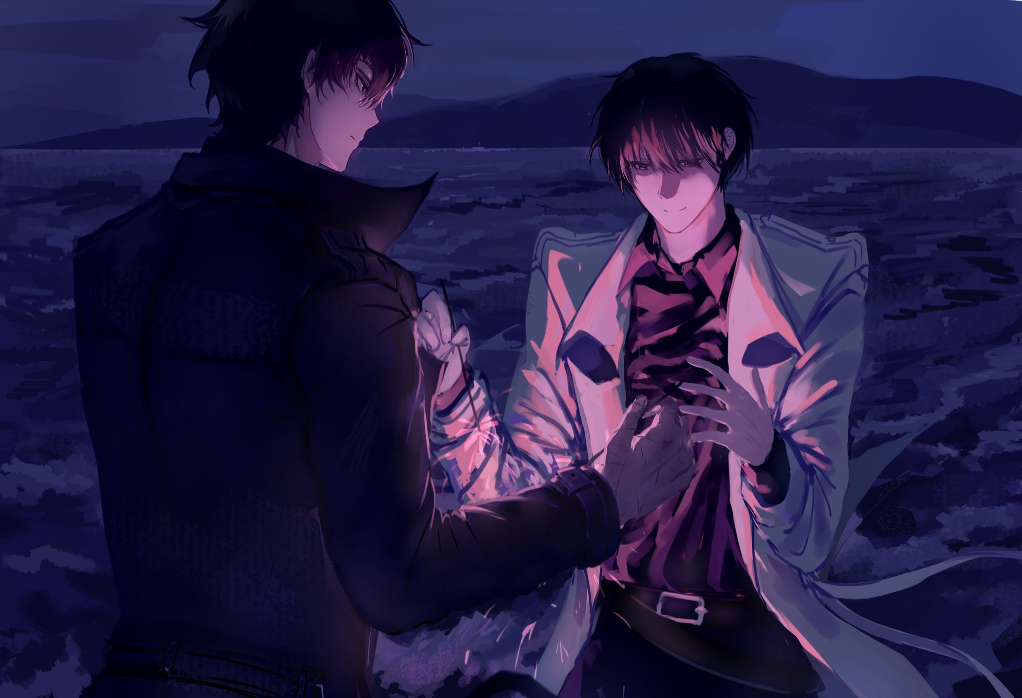 2boys black_coat black_hair black_shirt coat collared_shirt ex3szh7983 fireworks hands_up highres holding holding_fireworks kim_dokja male_focus mountainous_horizon multiple_boys night ocean omniscient_reader's_viewpoint open_clothes open_coat outdoors popped_collar shirt short_hair sparkler underlighting white_coat yoo_joonghyuk