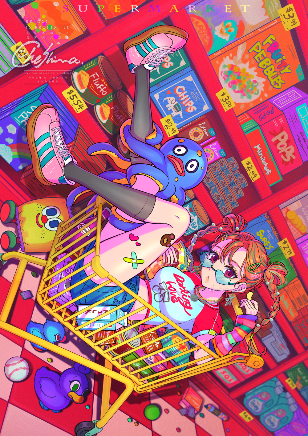 1girl animal_sticker arm_warmers bag_of_chips ball baseball_(object) black_socks braid braided_twintails breasts cherry_print chetarou chips_(food) closed_mouth clothes_writing colorful comitia_150 commentary_request crop_top cropped_shirt crossed_bandaids cursive denim denim_shorts double-parted_bangs dutch_angle expressionless food food_print fruit_print full_body hand_up heart heart-shaped_eyewear heart_sticker highres holding holding_food in_shopping_cart kneehighs looking_at_viewer looking_over_eyewear medium_breasts midriff original pink_shoes potato_chips price print_shirt raglan_sleeves red_eyes red_sleeves shelf shirt shoes shopping_cart short_shorts short_sleeves shorts sneakers socks solo sticker sticker_on_leg striped_arm_warmers stuffed_animal stuffed_octopus stuffed_toy supermarket tile_floor tiles twin_braids white_shirt