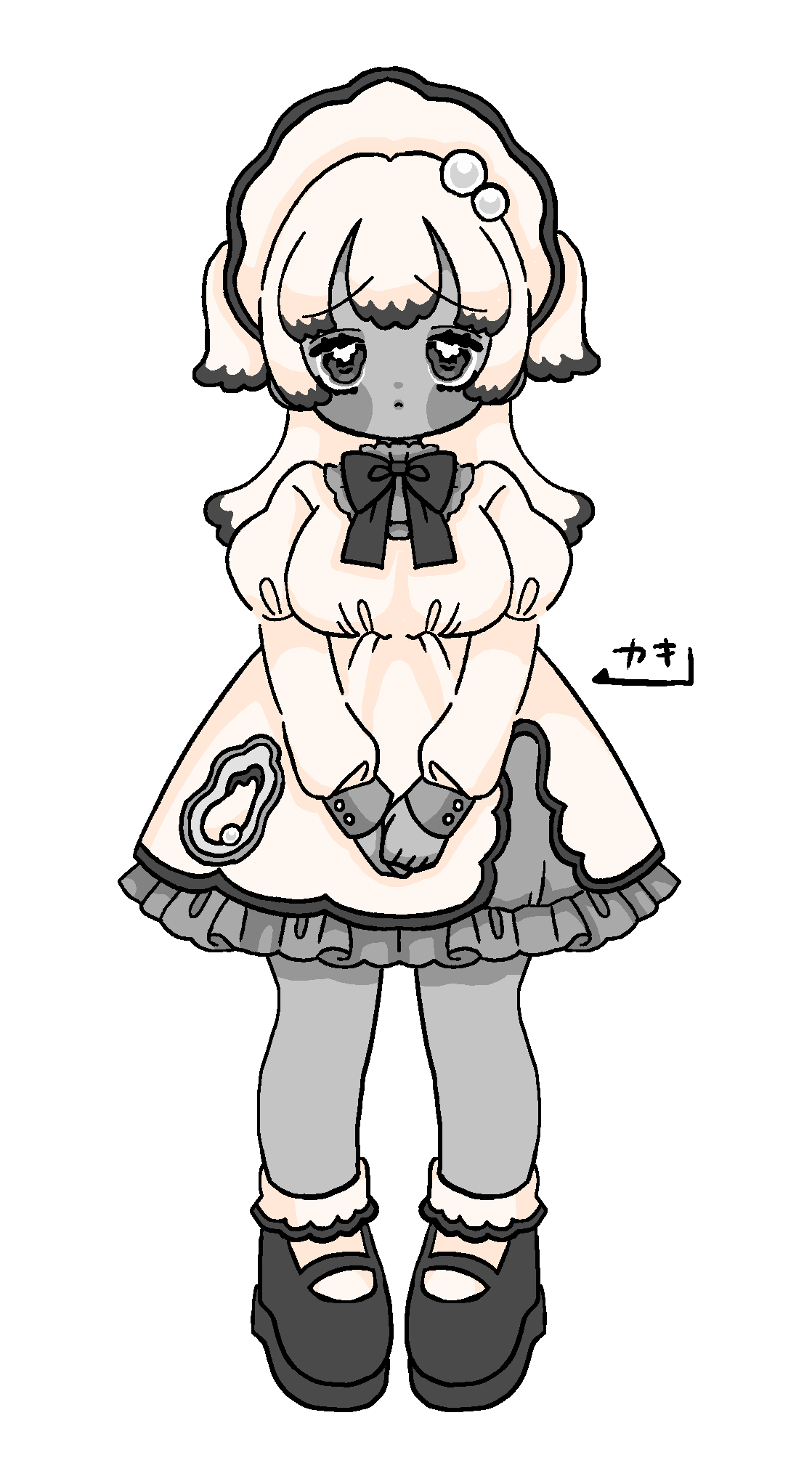 1girl :< ankle_socks black_hair blush_stickers bobby_socks bow bowtie colored_skin colored_tips commentary_request dress frills full_body gem grey_eyes grey_skin headdress highres limited_palette lolita_fashion long_hair long_sleeves mary_janes multicolored_hair original own_hands_together oyster pearl_(gemstone) pearl_hair_ornament personification puffy_long_sleeves puffy_sleeves shoes socks solo two-tone_hair two_side_up v_arms white_dress white_hair yumemixxxxx