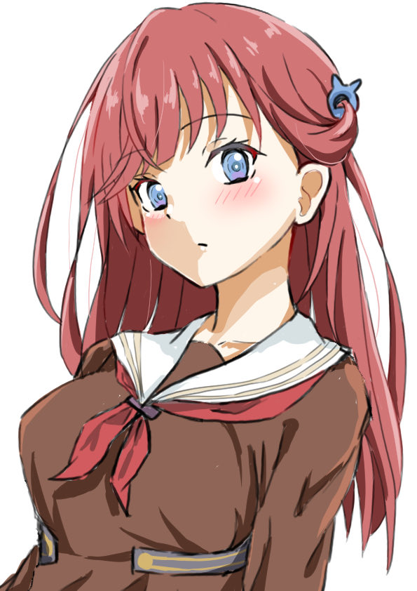 1girl blue_eyes blush breasts brown_dress closed_mouth collarbone commentary_request dress hair_ornament hasu_no_sora_school_uniform ikuto_(nanami_ice) kinjou_maika link!_like!_love_live! long_hair long_sleeves looking_at_viewer love_live! medium_breasts neckerchief red_hair red_neckerchief sailor_collar sailor_dress school_uniform simple_background solo straight_hair upper_body virtual_youtuber white_background white_sailor_collar winter_uniform