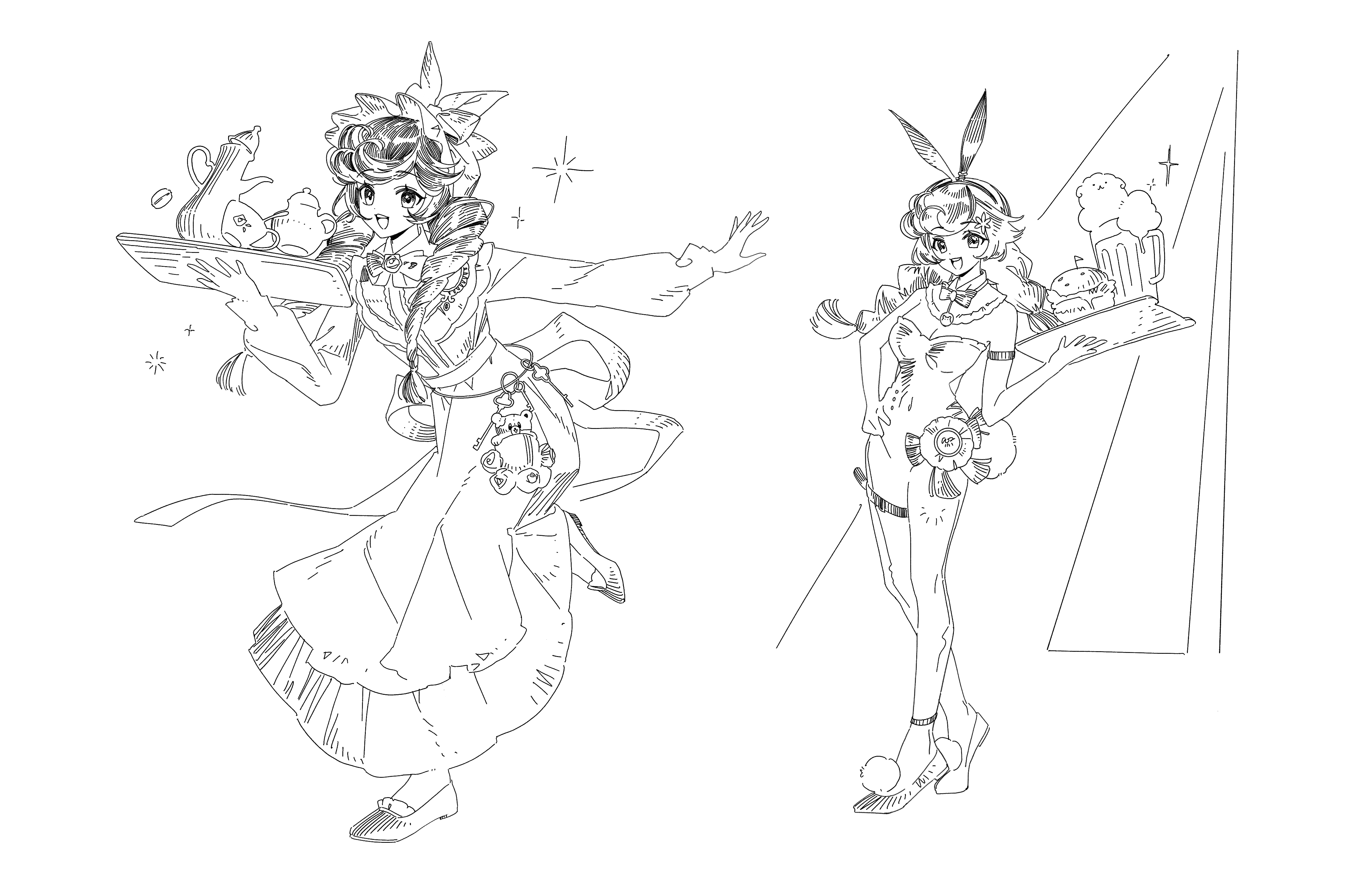 1girl :d absurdres animal_ears bare_shoulders beer_mug bow bowtie braid breasts bunny_bunny_(reverse:1999) burger chinese_commentary cleavage commentary_request cup detached_collar dress drill_hair fake_animal_ears flower foam food full_body greyscale hair_flower hair_ornament hand_on_own_hip hat highres holding holding_tray leotard lineart long_dress long_hair low_twin_braids monochrome mug multiple_views official_alternate_costume open_mouth playboy_bunny pom_pom_footwear rabbit_ears rabbit_tail red_eyes reverse:1999 running shoes smile sparkle strapless strapless_leotard tail teacup teapot tray twin_braids twin_drills walking white_background xiaoxiaowu
