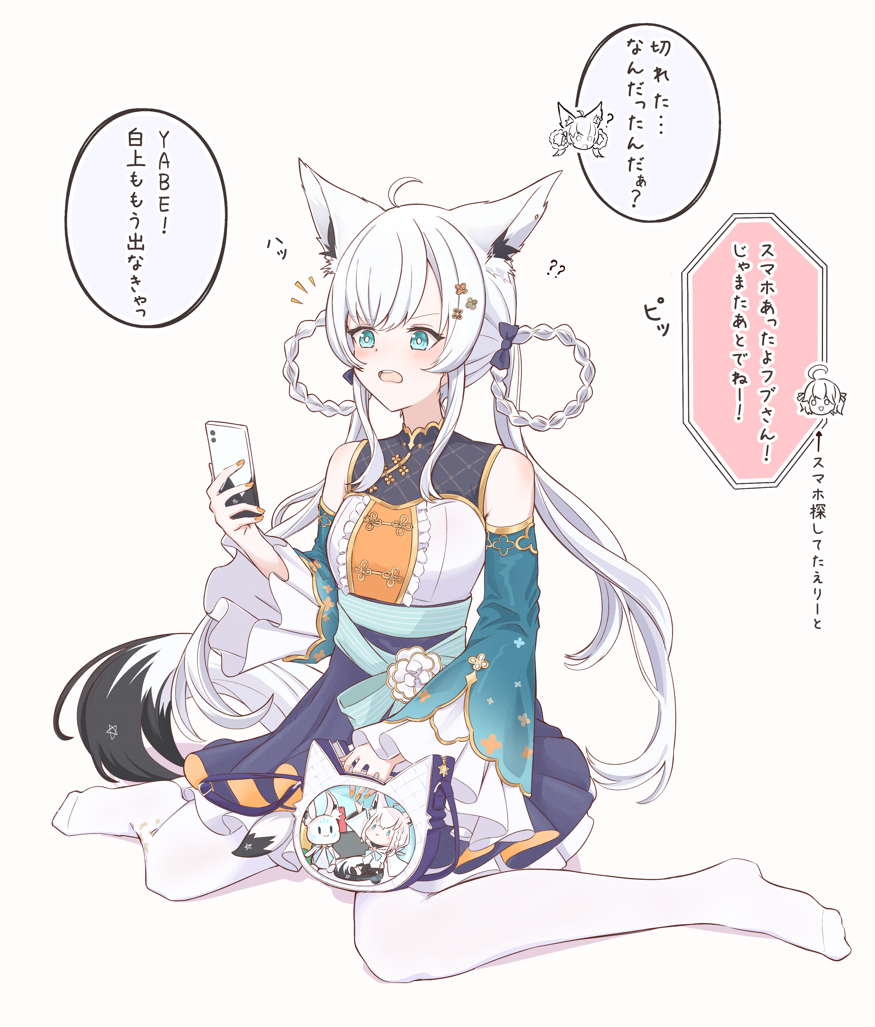 1girl absurdres ahoge animal_ears bare_shoulders black_skirt blue_eyes braid braided_hair_rings bright_pupils cellphone center_frills chamomile_(kazumasa) chinese_clothes commentary_request detached_sleeves feet fox_ears fox_girl fox_tail frilled_sleeves frills hair_ornament hair_rings hairclip highres holding holding_phone hololive layered_skirt lolita_fashion long_hair looking_at_phone mandarin_collar nail_polish no_shoes official_alternate_costume open_mouth orange_nails petticoat phone qi_lolita shirakami_fubuki shirakami_fubuki_(waitress) sidelocks sitting skirt smartphone solo sukonbu_(shirakami_fubuki) tail twintails virtual_youtuber wariza white_hair white_pupils wide_sleeves