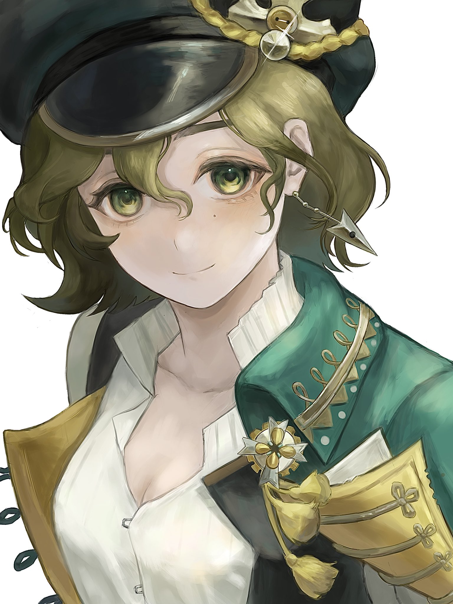 1girl black_vest breasts brown_hair cape cleavage commentary_request earrings green_cape green_eyes green_hat hat highres jewelry kanichiwawa mole mole_under_eye newsboy_cap open_clothes open_vest portrait recoleta_(reverse:1999) reverse:1999 shirt short_hair side_cape single_earring smile solo vest white_background white_shirt