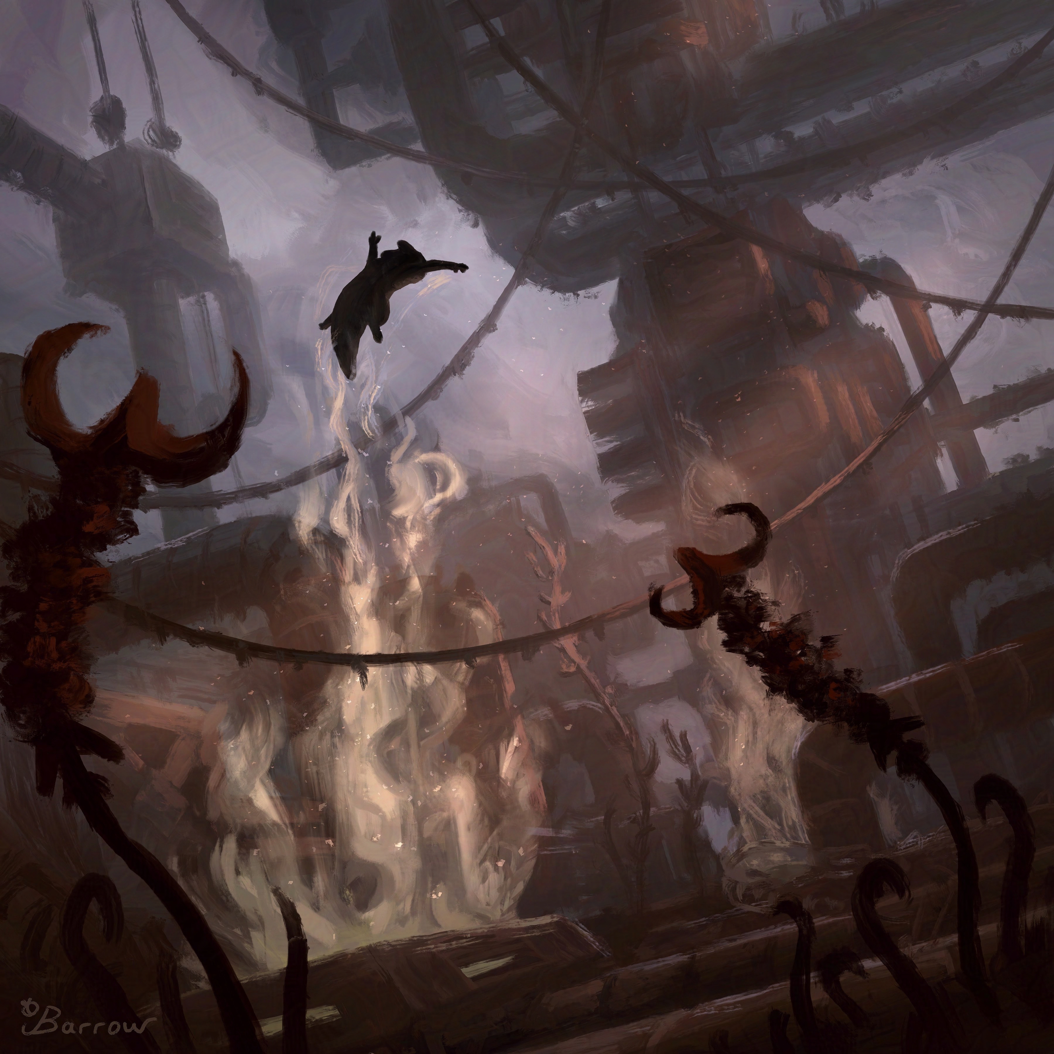 absurdres artist_name building commentary creature creature_focus english_commentary grey_sky highres jamesbbarrow midair no_humans outdoors plant rain_world signature sky slugcat steam sunlight watcher_(rain_world)