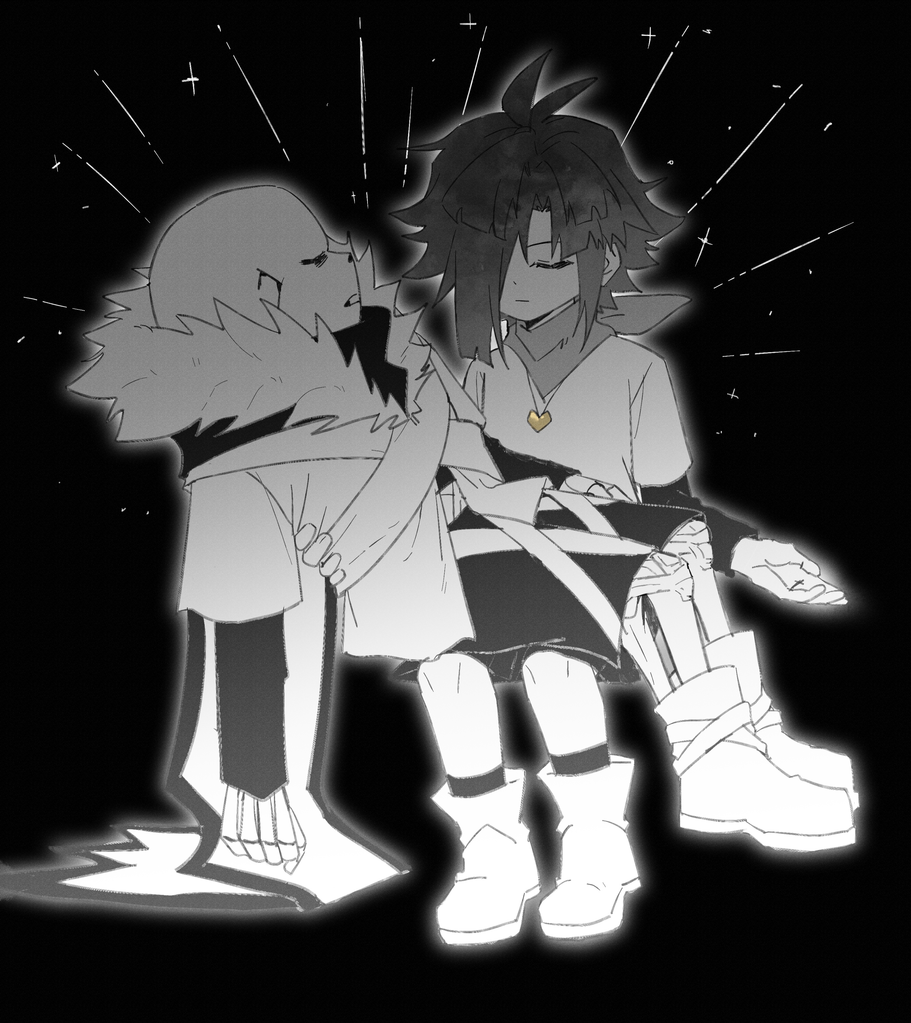 2boys :| absurdres alternate_universe ankle_boots ankle_socks antenna_hair bandana bandana_around_neck belt black_background boots child chinese_commentary clenched_teeth closed_eyes closed_mouth commentary_request expressionless facing_another film_grain flipped_hair frisk_(undertale) full_body fur-trimmed_jacket fur_trim glowing gold_necklace greyscale hair_over_one_eye hanbaobaobaozhu heart heart_necklace highres jacket jewelry layered_sleeves light_frown long_sleeves male_focus monochrome multiple_boys necklace one_eye_covered outline sans_(undertale) shirt short-sleeved_jacket short_hair short_over_long_sleeves short_sleeves shorts simple_background sitting sitting_on_lap sitting_on_person skeleton socks spot_color sweater t-shirt teeth turtleneck turtleneck_sweater u_u undertale utdr_(toby_fox) xtale