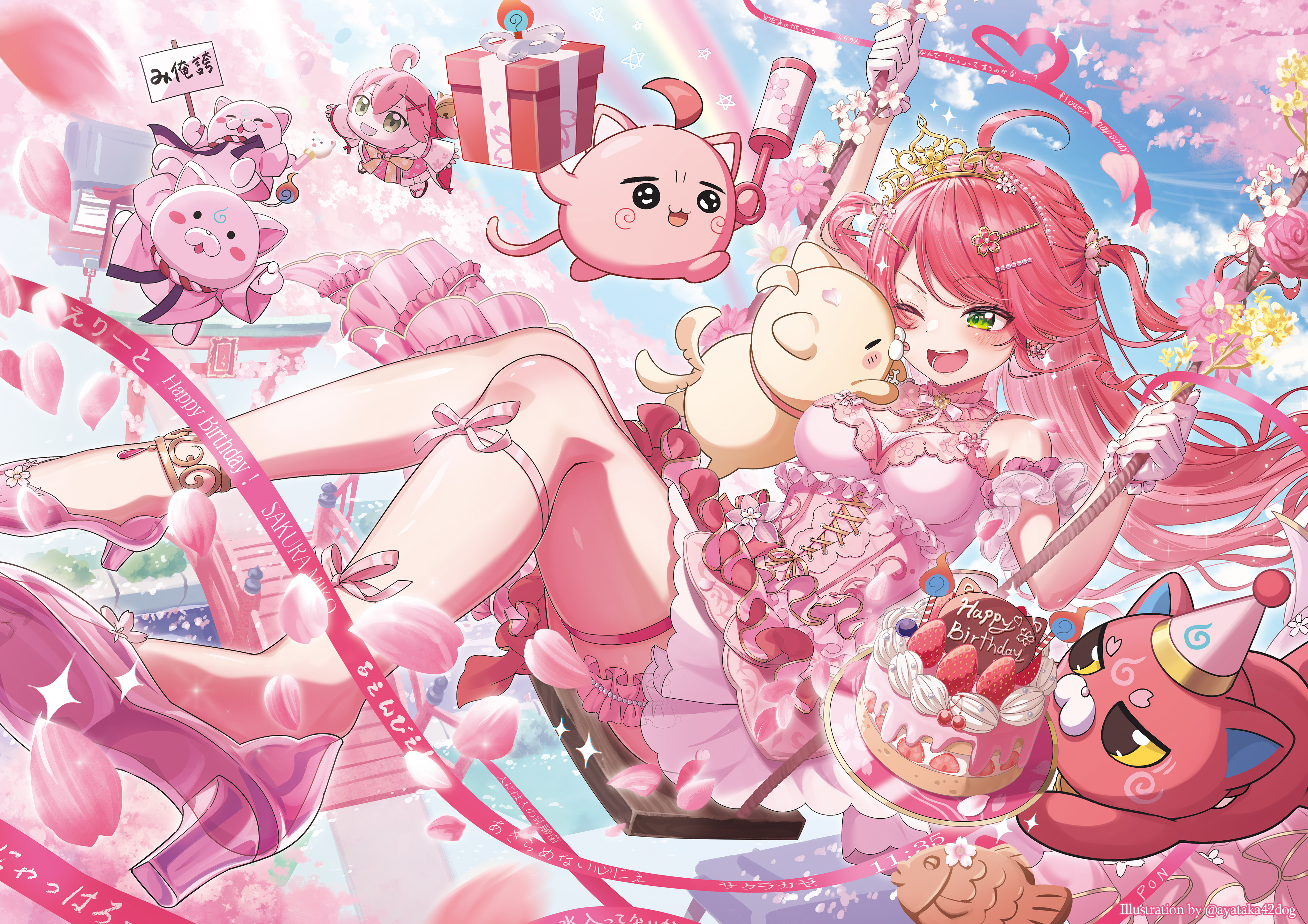 1girl 35p_(sakura_miko) ;d absurdres ahoge ayataka birthday_cake braid breasts cake cherry_blossoms cleavage_cutout clothing_cutout commentary_request cross-laced_clothes cross-laced_dress dress falling_petals flower food frilled_dress frilled_thigh_strap frills gloves green_eyes hair_flower hair_ornament hairclip happy_birthday high_heels highres hololive inuchi_(sakura_miko) kintoki_(sakura_miko) knee_strap long_hair maguchi_(sakura_miko) medium_breasts mikodanye official_alternate_costume official_alternate_hairstyle on_swing one_eye_closed open_mouth outdoors partial_commentary petals pink_dress pink_hair pink_shoes sakura_miko sakura_miko_(flower_fantasista!) shoe_soles shoes short_dress side_braids smile solo swept_bangs swing thigh_strap tiara tilted_headwear two_side_up very_long_hair virtual_youtuber white_gloves
