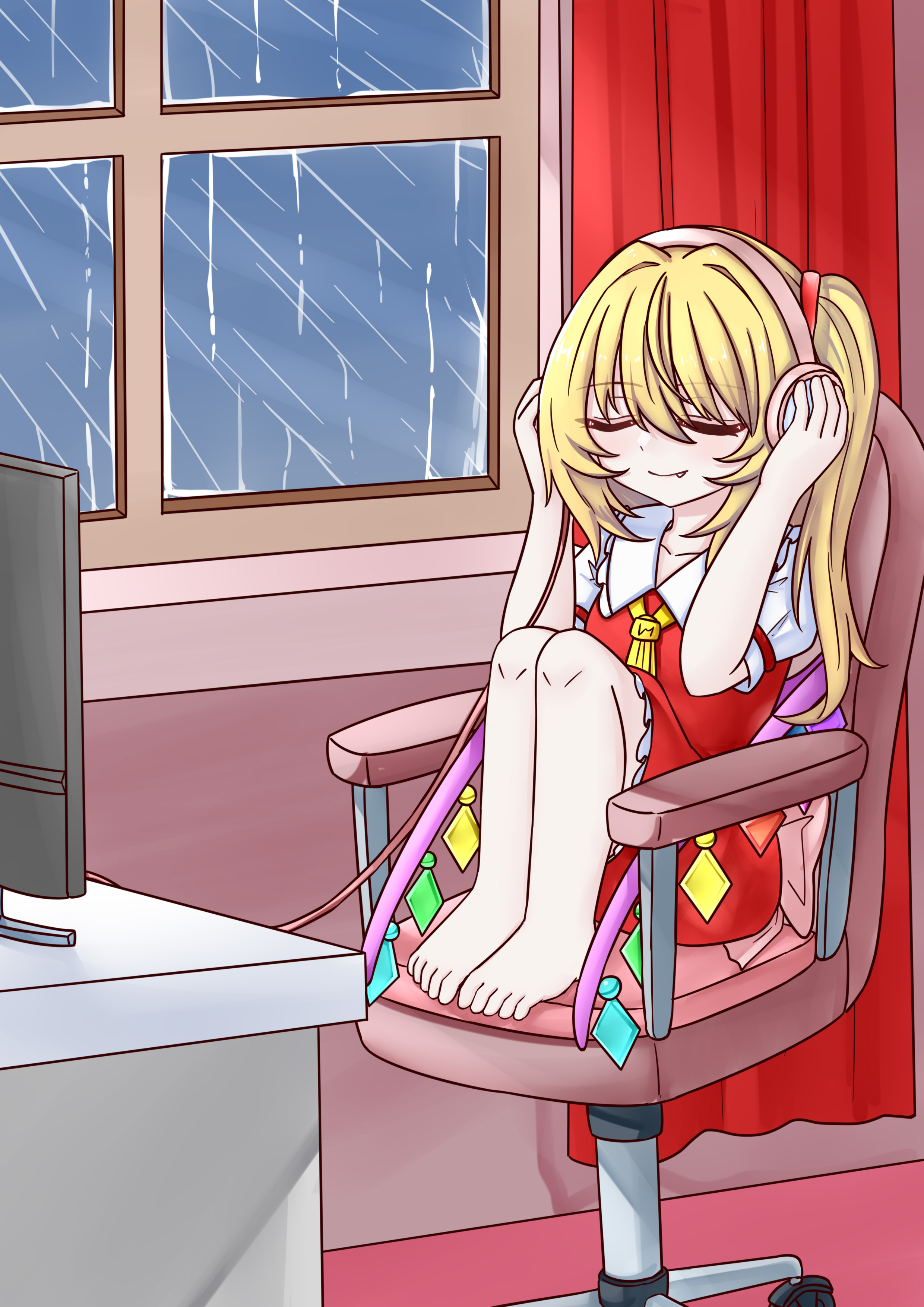 1girl absurdres ascot blonde_hair chair closed_eyes closed_mouth commentary crystal crystal_wings curtains eroelu fang fang_out flandre_scarlet frilled_skirt frills hat headphones highres indoors missing_headwear monitor multicolored_wings one_side_up puffy_short_sleeves puffy_sleeves rain red_skirt red_vest shirt short_sleeves sitting skirt skirt_set solo swivel_chair touhou vest white_shirt window wings yellow_ascot