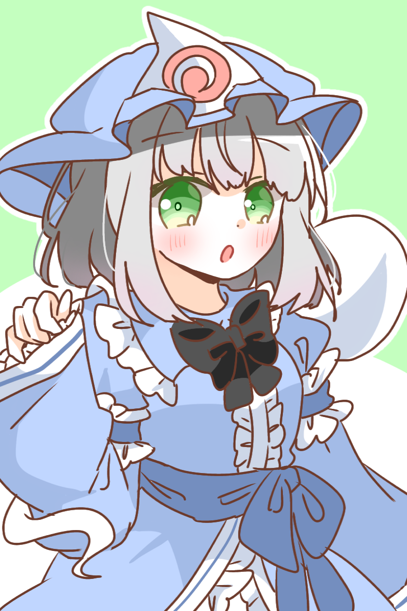 1girl alternate_costume black_bow black_bowtie blue_hat blue_kimono blush bow bowtie commentary_request cosplay frilled_kimono frilled_sleeves frills green_eyes grey_hair hat highres hitodama japanese_clothes kimono konpaku_youmu konpaku_youmu_(ghost) long_sleeves looking_at_viewer mob_cap open_mouth saigyouji_yuyuko saigyouji_yuyuko_(cosplay) sleeve_garter solo touhou triangular_headpiece wakana1327 wide_sleeves