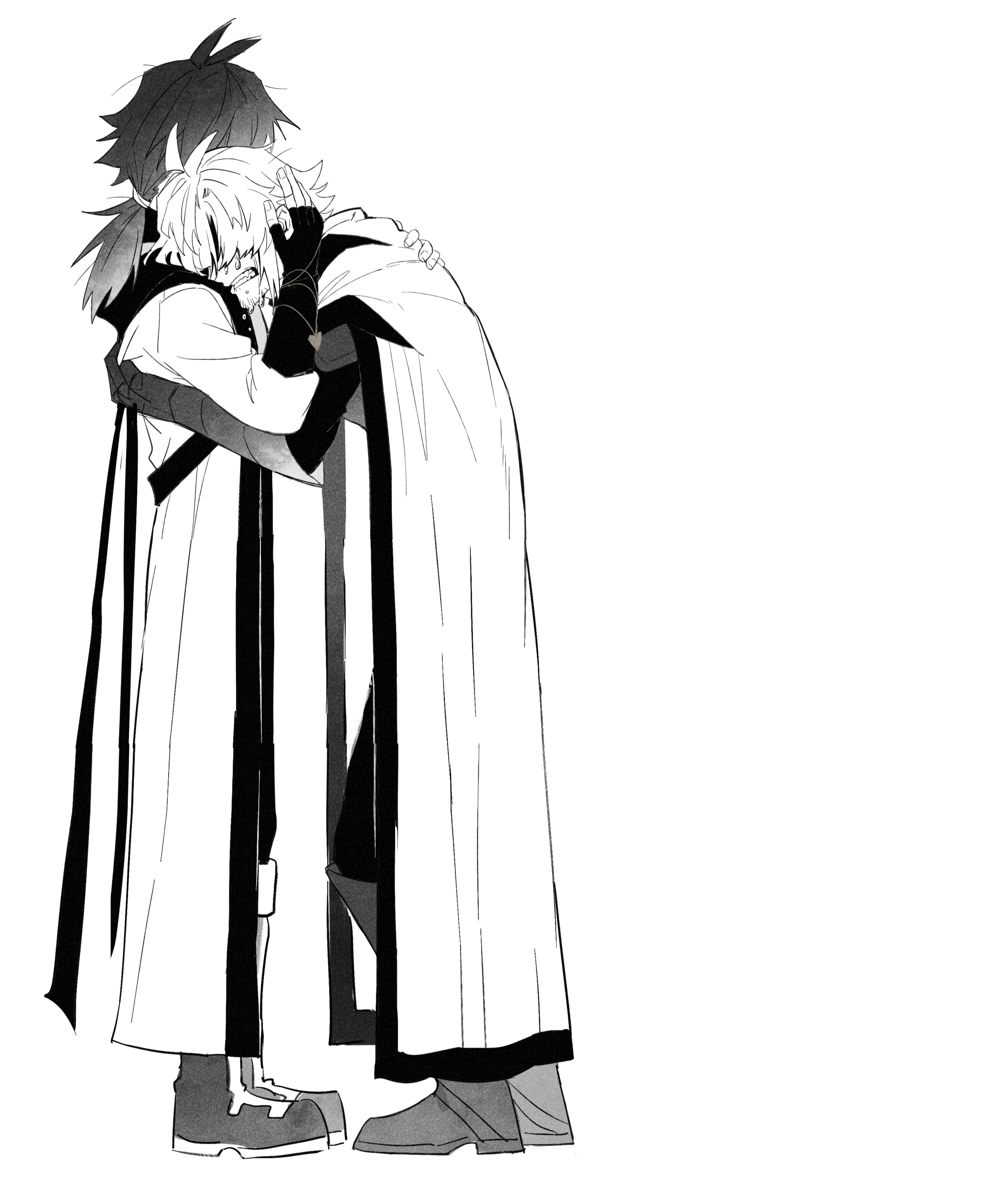 2boys absurdres alternate_universe antenna_hair armor armored_boots boots brothers cape chara_(undertale) chinese_commentary clenched_teeth coat commentary_request covered_eyes crying elbow_gloves facial_hair film_grain fingerless_gloves fingernails flipped_hair frisk_(undertale) from_side full_body gloves gold_necklace greyscale hair_over_eyes hair_tie hanbaobaobaozhu hand_on_another's_back hand_on_another's_head head_on_another's_shoulder heart heart_necklace high_contrast high_heel_boots high_heels highres holding holding_jewelry holding_necklace hug hunched_over jewelry knee_boots low_ponytail male_focus medium_hair monochrome multiple_boys necklace open_clothes open_coat pants ponytail profile puffy_sleeves short_hair siblings simple_background spot_color standing teeth three-quarter_sleeves undertale utdr_(toby_fox) white_background xtale