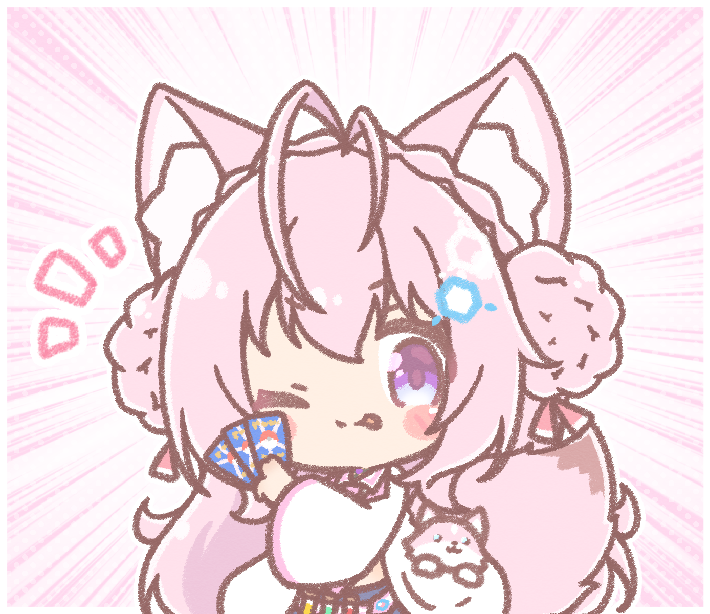 1girl ;p animal_ear_fluff animal_ears blue_skirt blush_stickers card chibi closed_mouth collared_shirt commentary_request double_bun emphasis_lines hair_bun hakui_koyori hakui_koyori_(1st_costume) highres holding holding_card hololive in_pocket jacket kokoro_(hakui_koyori) long_hair long_sleeves mitarashi_neko nintendo notice_lines one_eye_closed open_clothes open_jacket pink_hair pokemon pokemon_tcg shirt skirt smile tail tongue tongue_out very_long_hair vial virtual_youtuber white_jacket white_shirt wide_sleeves