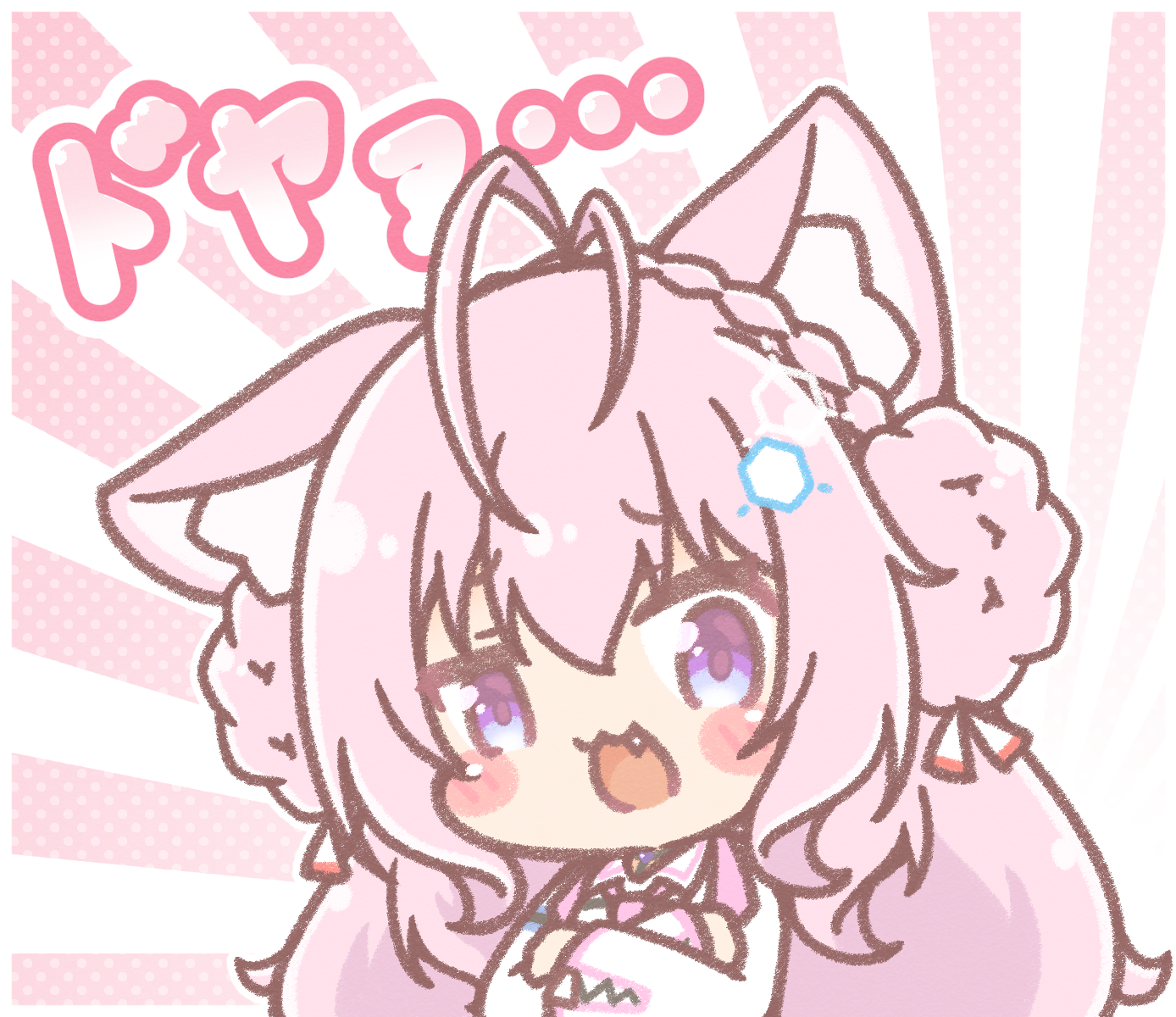 1girl :d animal_ear_fluff animal_ears antenna_hair braid chibi collared_shirt commentary_request crossed_arms crown_braid double_bun fang hair_between_eyes hair_bun hakui_koyori hakui_koyori_(1st_costume) highres hololive jacket long_hair looking_at_viewer mitarashi_neko one_ear_down open_mouth pink_hair polka_dot polka_dot_background purple_eyes shirt smile solo sunburst sunburst_background tail translation_request very_long_hair virtual_youtuber white_jacket white_shirt