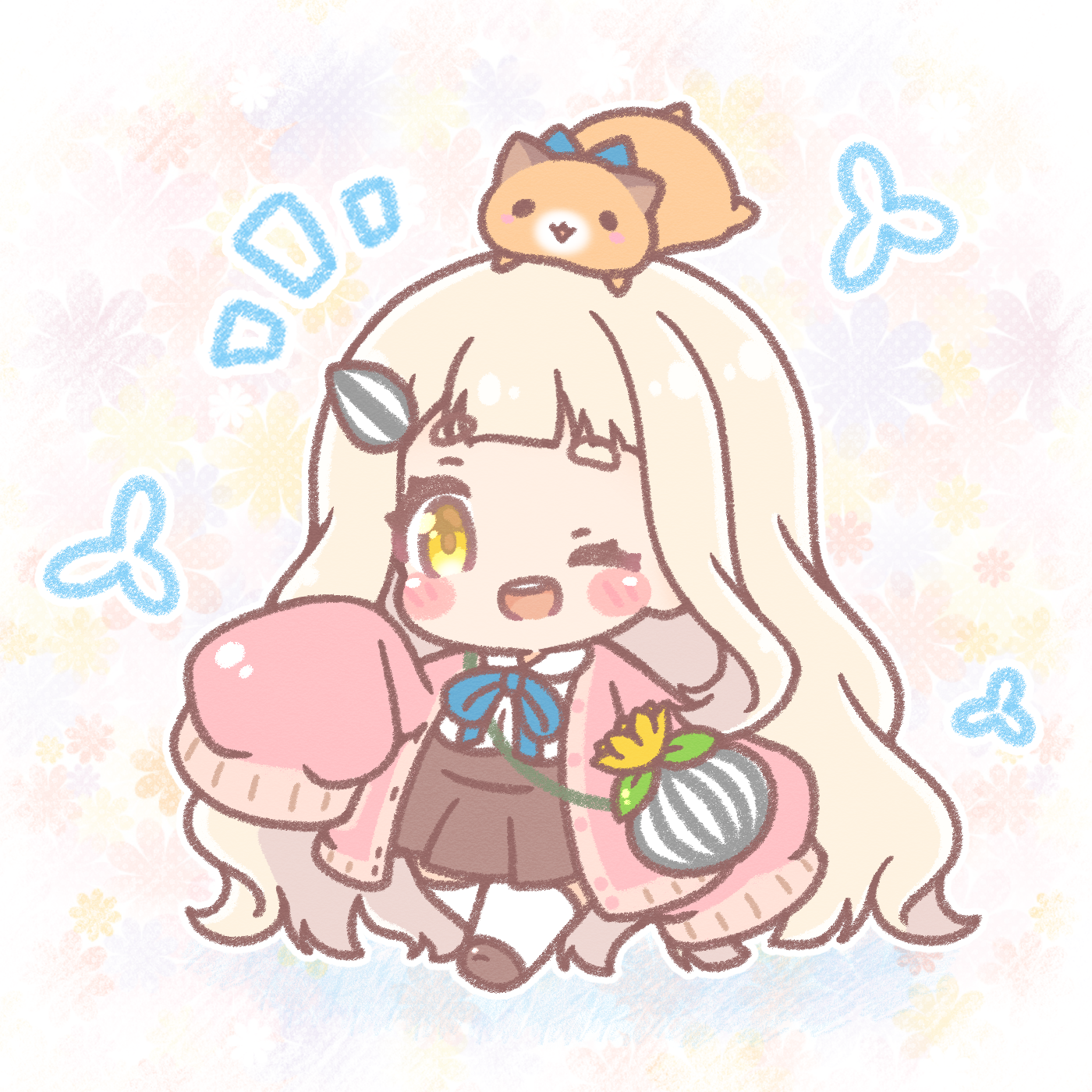 1girl ;d bag blonde_hair blue_bow blush_stickers bow brown_shoes brown_skirt chibi collared_shirt colored_shadow commentary_request commission floral_background gonzalez_(machita_chima) hair_ornament highres jacket long_sleeves machita_chima machita_chima_(1st_costume) mitarashi_neko nijisanji notice_lines one_eye_closed open_clothes open_jacket open_mouth pink_jacket pixiv_commission pleated_skirt puffy_long_sleeves puffy_sleeves seed shadow shirt shoes short_eyebrows shoulder_bag skirt sleeves_past_fingers sleeves_past_wrists smile sunflower_seed teeth thick_eyebrows thighhighs upper_teeth_only virtual_youtuber walking white_shirt white_thighhighs yellow_eyes