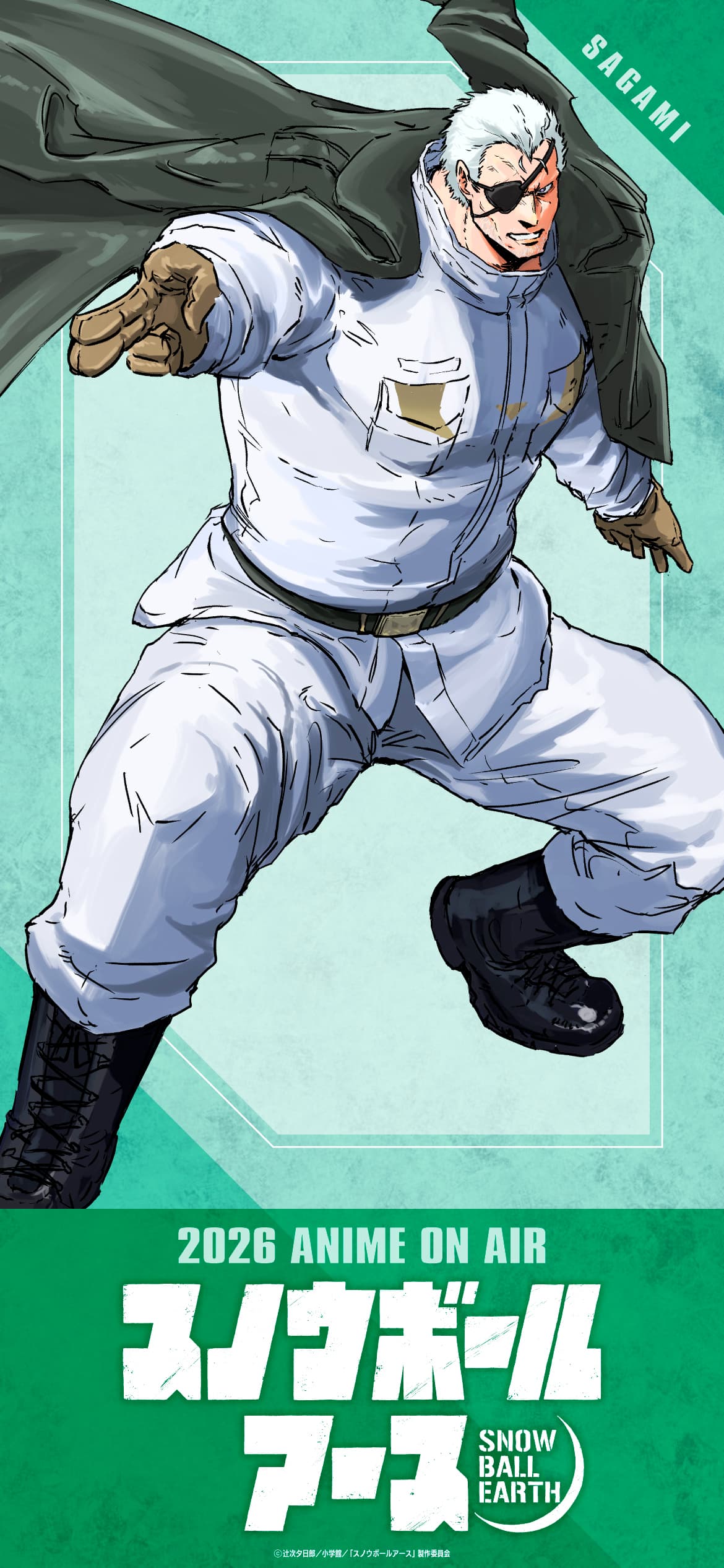 1boy absurdres boots brown_gloves character_name coat coat_on_shoulders copyright_name english_text eyepatch facial_hair fighting_stance full_body gloves highres jacket jacket_on_shoulders japanese_text looking_at_viewer male_focus mature_male military military_uniform muscular muscular_male official_art old old_man pants pectorals sagami_isseki scar scar_across_eye scar_on_face short_hair smile snowball_earth solo strongman_waist studio_kai tsujitsugu_yuuhirou white_hair white_pants
