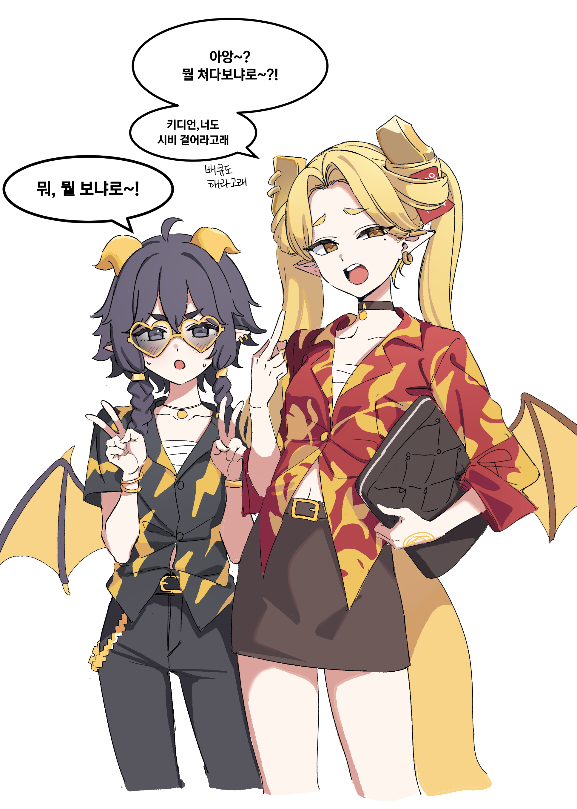 2girls absurdres belt black_choker black_eyes black_pants black_tail blonde_hair bracelet braid breasts brown_belt brown_skirt chain chest_sarashi choker collarbone collared_shirt commentary_request dickbomber double_v dragon_girl dragon_horns dragon_tail dragon_wings earrings flat_chest gold_chain gold_necklace heart heart-shaped_eyewear height_difference highres horns jewelry kidian_(trickcal) korean_commentary korean_text looking_at_viewer low_twin_braids middle_finger mole mole_under_eye multiple_girls necklace official_alternate_costume pants partially_unbuttoned pencil_skirt pira_(trickcal) pointy_ears print_shirt sarashi shirt simple_background skirt small_breasts standing sweatdrop tail translation_request trickcal twin_braids twintails v white_background wings yellow_eyes