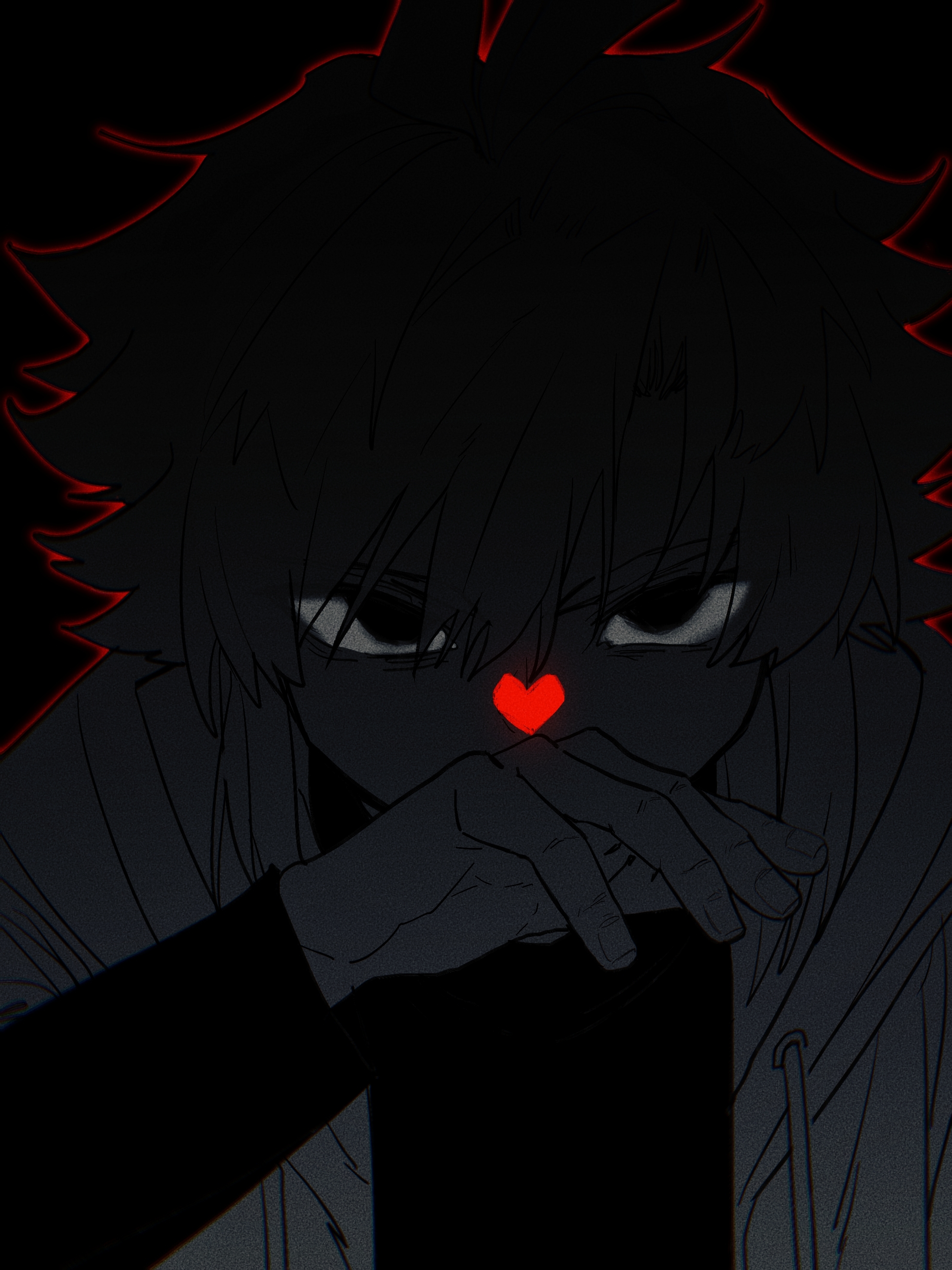 1boy absurdres alternate_universe antenna_hair black_background chara_(undertale) chinese_commentary commentary_request covered_mouth covering_own_mouth double-parted_bangs drawstring empty_eyes eyes_in_shadow film_grain fingernails flipped_hair greyscale hair_between_eyes hanbaobaobaozhu hand_up heart highres hood hood_down hooded_jacket hunched_over jacket layered_sleeves long_sleeves looking_at_viewer male_focus monochrome no_pupils open_clothes open_jacket outline red_outline shirt short-sleeved_jacket short_hair short_over_long_sleeves short_sleeves sidelocks simple_background solo soul_(deltarune) spot_color straight-on undertale upper_body utdr_(toby_fox) xtale