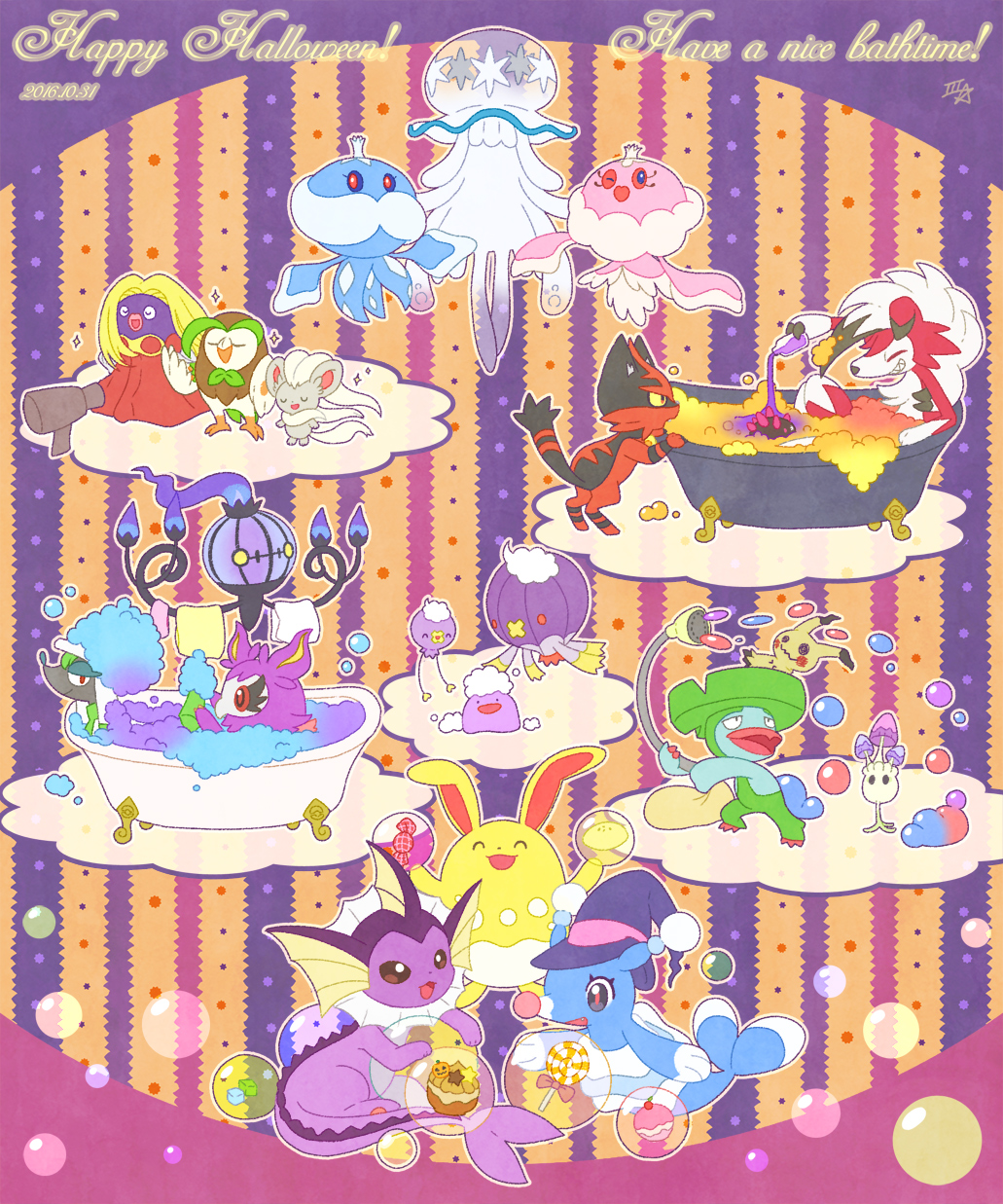 alternate_color aromatisse azumarill bath bathing bathtub bottle brionne bubble bubble_bath candy chandelure cinccino claw_foot_bathtub closed_eyes closed_mouth commentary_request dartrix dated ditto drifblim drifloon english_text food furfrou furfrou_(dandy) gen_1_pokemon gen_2_pokemon gen_3_pokemon gen_4_pokemon gen_5_pokemon gen_6_pokemon gen_7_pokemon hair_dryer happy_halloween hat highres holding holding_bottle in_bathtub jellicent jellicent_(female) jellicent_(male) jynx lollipop lombre lycanroc lycanroc_(midnight) mimikyu morelull nihilego nintendo one_eye_closed open_mouth poke_puff pokemon pokemon_(creature) pokemon_focus pouring purple_hat pyukumuku samsung_(yuzuikka) shiny_pokemon signature smile soap_bubbles swirl_lollipop torracat towel ultra_beast vaporeon witch_hat