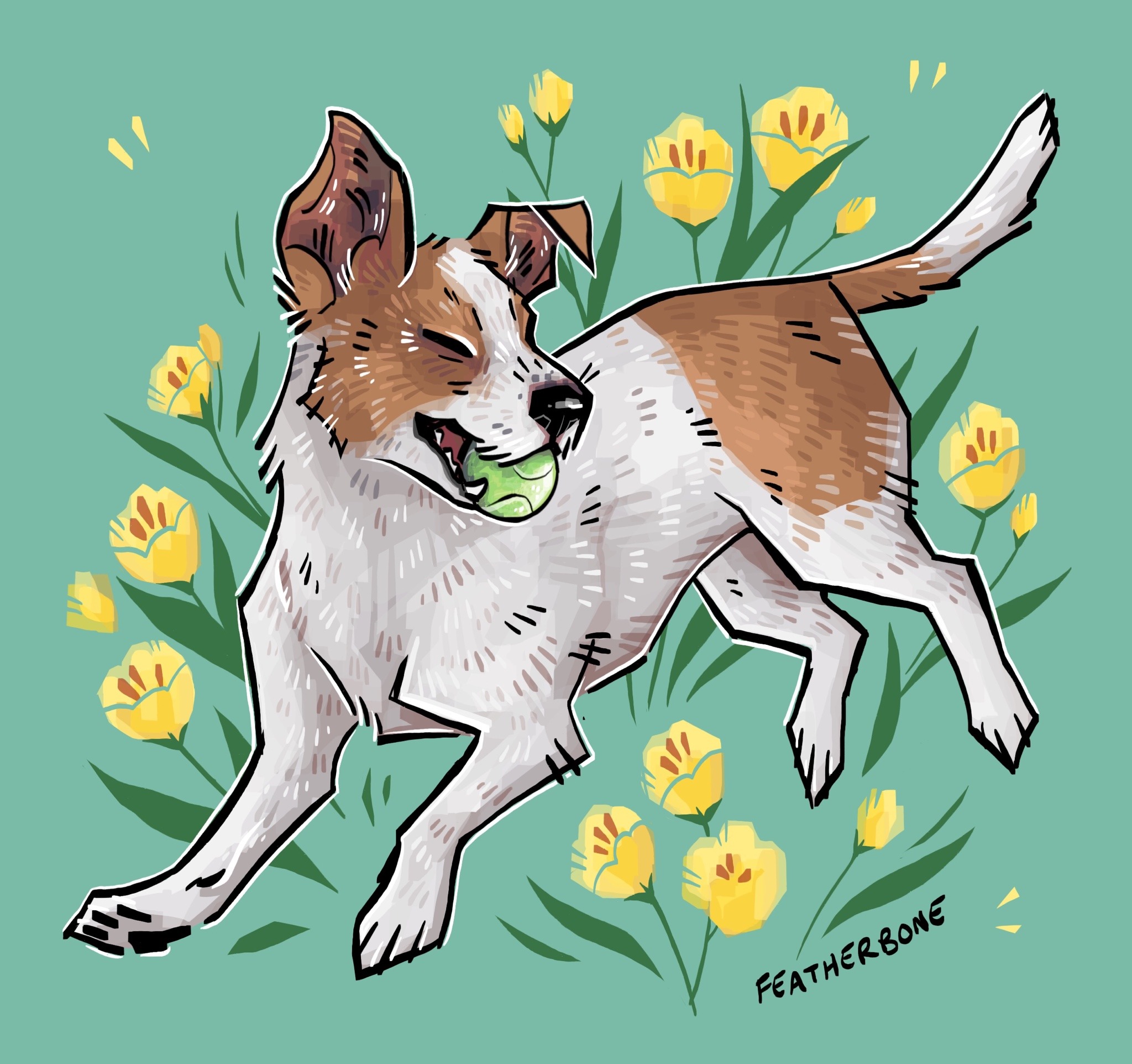 animal_focus aqua_background artist_name ball brown_fur closed_eyes commentary dog english_commentary feather-bone flower highres jack_russell_terrier original simple_background tennis_ball two-tone_fur white_fur yellow_flower